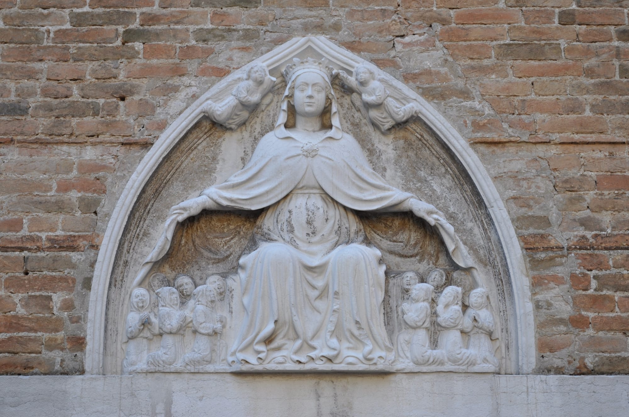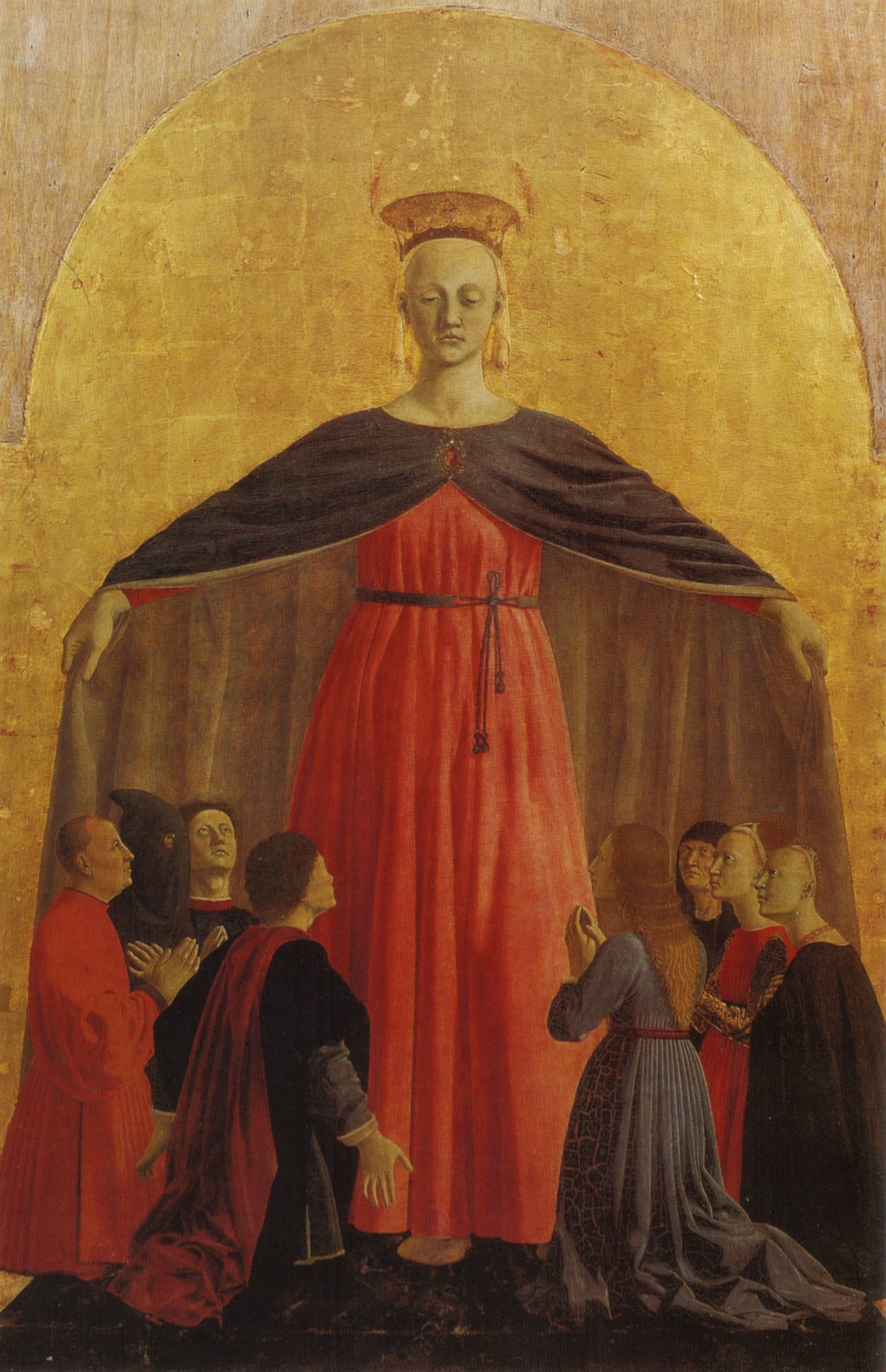 The Madonna of Mercy, one of the many guises of the Virgin Mary, is an iconographic type common during the Middle Ages and Renaissance. The Virgin, large and central, opens her arms to protect tiny supplicants underneath. The Madonna of Mercy type emphasizes the Virgin’s maternal protection of her spiritual children.