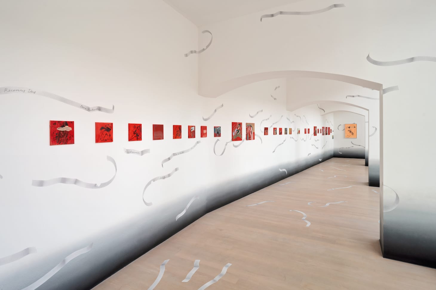 During the pandemic she created a series of works in this shade of red, titled Is Today Tomorrow, which addresses the lost structure of the day and disrupted conception of time. At the end of the long corridor lined with several red, small-format paintings that metamorphose between figurative and abstract, is a yellow painting, which marks the close of the series. The eyes open, the red vanishes, and the gaze falls on a bright picture with the programmatic title “Time for Change,” which depicts two figures merged into each other.