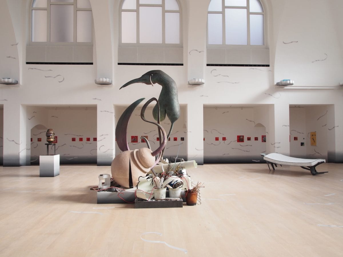 The most prominent work in this room is the large sculpture “3, 2, 1” (2021). A crow-like form with breasts, shedding a tear, rises from the center of a platform, like a phoenix from the ashes. The “ashes” resemble a garbage dump composed of remnants of Henrot’s artistic creations from the foundry. The garbage nest points to the connection between creation and waste that refers to our collective decline because of human consumerism as well as the burden of the mother who creates in a world overflowing with waste. Henrot based the sculpture on the German term Rabenmutter (literally translated to English as “raven mother”), a term for a bad mother (it’s worth noting that there is no equivalent term for father or a caregiver in general). The title “3, 2, 1” can be understood as a countdown toward a (potentially self-made) state of urgency. These works undermine the ideal of a mother or caregiver, in part by converging nature and animals with human beings, and by depicting gender and even species as fluid.