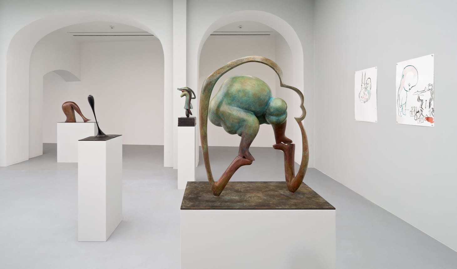 Henrot’s bronze sculptures call to mind those of Henry Moore or Constantin Brâncuși, although this sculpture recalls Hans Bellmer’s “poupees” (dolls), and their violently misogynistic undertones. The backside of “L’enfant Plus” is a plump butt, cheekily thrust out at the viewer. It may be a sly commentary on the modernism of Moore and Brâncuși, but it also seems like a surprising allusion to the putto in Renaissance art: the missing chubby cherub who should be holding up all the flying banderoles, and without whom the messages float aimlessly.