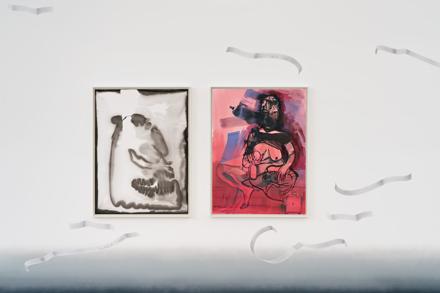 With the paintings “Untitled (soon)” and “Wet Job” (both 2019), Henrot reflects on the invisible image, of the reality of motherhood and the unborn child, in different ways. The former recalls ultrasound images taken during pregnancy. Using ink on soaked paper she evokes the physical environment of the womb. Boundaries become blurred, polarities of inside and outside are taken up thematically as well as visually. Watercolor lines snake through the picture. As the motif oscillates between visibility and hiding, it suggests a shy hybrid creature searching for its form. The kind of coming-into-being that Henrot achieves in the work seems almost about the autonomy of the line and the creative process itself.