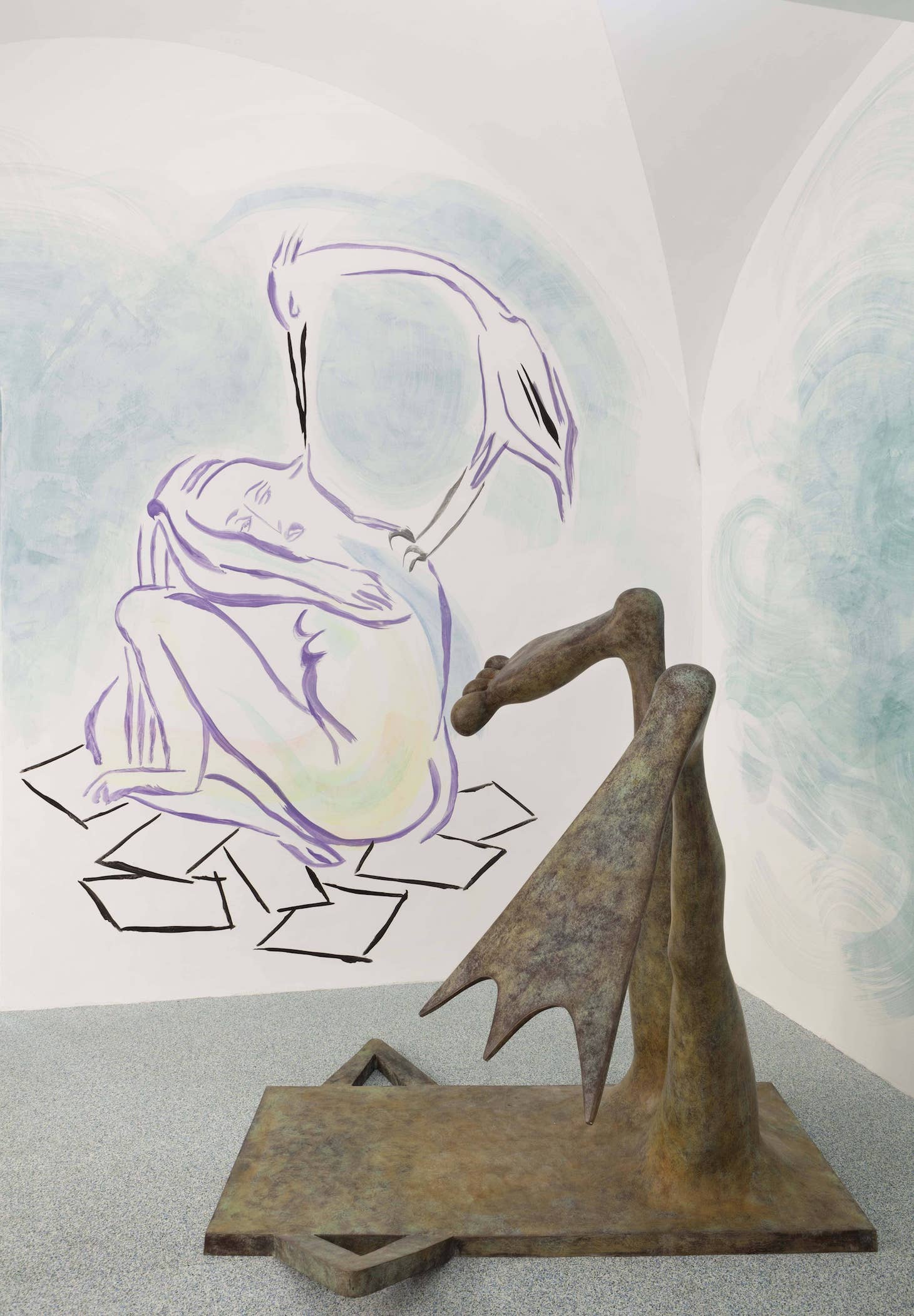 The last room forms a chapel lined with seven frescoes (Monday series, 2016). The ecclesiastical is embedded in the form of the fresco — frescoes are rarely found in contemporary art — but religious and mythological motifs are also apparent in the content and titles, joined with banal subject matter. One work is titled “Uneasy Moses.” Another conflates the Christian Annunciation with the myth of the stork delivering babies. A stork perches on the back of a seated woman and picks at her ear with its beak, both rendered as purple line drawings.