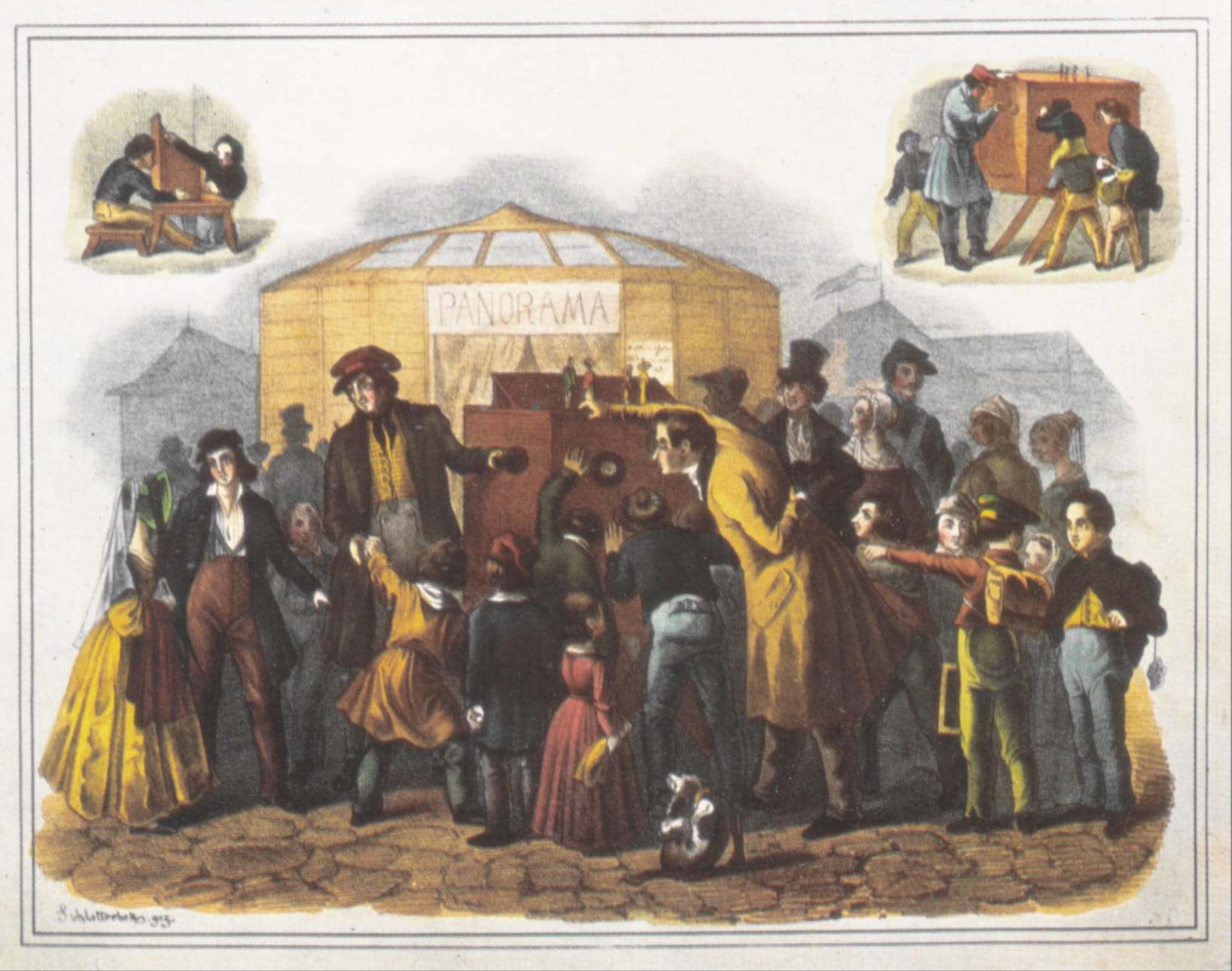 The wish to immerse ourselves in temporary out-of-this-world experiences hasn’t been fulfilled only by known artists and architects over the centuries but also by magic shows, amusement parks, and other forms of entertainment that while not being usually mentioned in traditional art history accounts, nonetheless play an influential role in shaping the expectations of those hungry for sensory satisfaction and surprise. Panorama theatres, 360-degrees paintings depicting historical scenes, geographically proportional views were conceived in the late 18th century and paved the way to the modern cinema and contemporary VR headsets. And these technological innovations are direct descendants of the so-called raree show, an older optical entertainment device with which it was possible to see scenes printed on paper and colored by hand, backlit by a candle. Its popularity was mainly due to street vendors who went to village festivals and asked the public to pay a few pennies to view the images.
