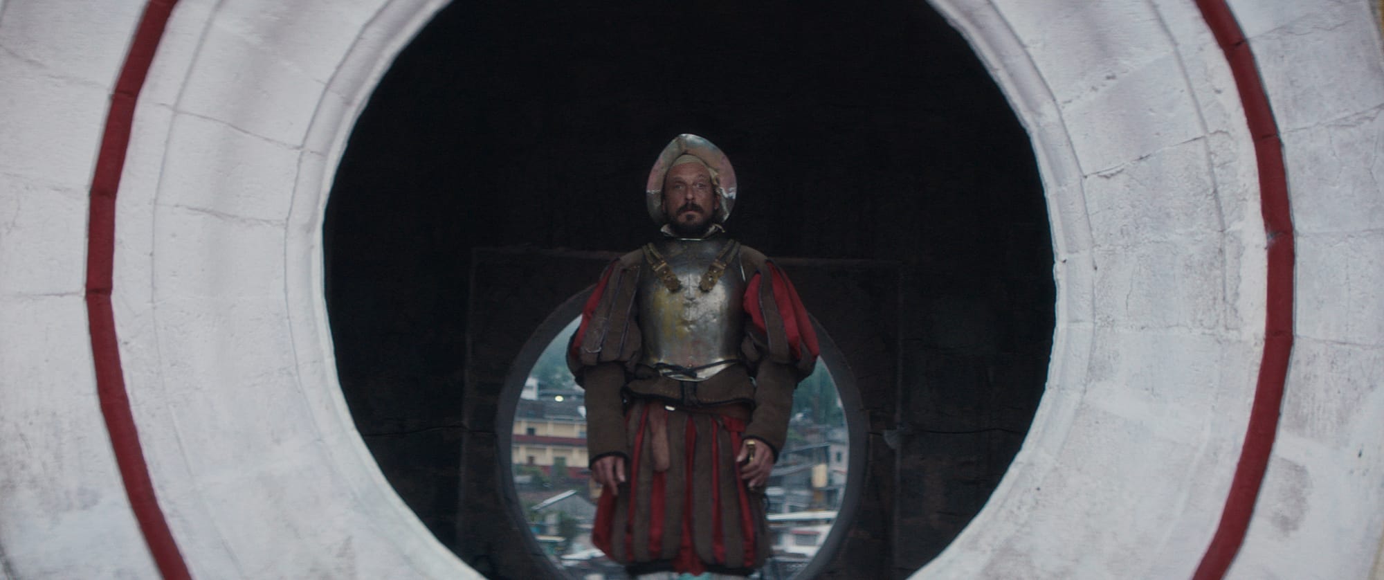 A conquistador of yore stumbles out of the turbulent waves of the sea. A woman's voice informs us that the impossible has occurred: This man is a ghost, the last of the vicious Spaniards who accompanied Hérnan Cortés on his brutal 1521 campaign against the Aztec Empire. He is now in the liminal space between the living and the dead, the past and the present, the colonizer and the colonized. But for what purpose? The nameless conquistador, played by Eduardo San Juan, stalks from the coast to Mexico City, retracing the bloody footsteps of Cortés. Simultaneously real yet intangible, his every action is suffused with magical realism. He tries to bark orders at a group of Indigenous schoolchildren, but his Catholic colonialist zeal halts as he realizes his words no longer matter. So begins 499, a surreal documentary/fiction hybrid by Mexican-American director Rodrigo Reyes. Reflecting on the 500-year anniversary of the Spanish conquest of Mexico, the film’s seemingly disparate elements in fact complement each other.