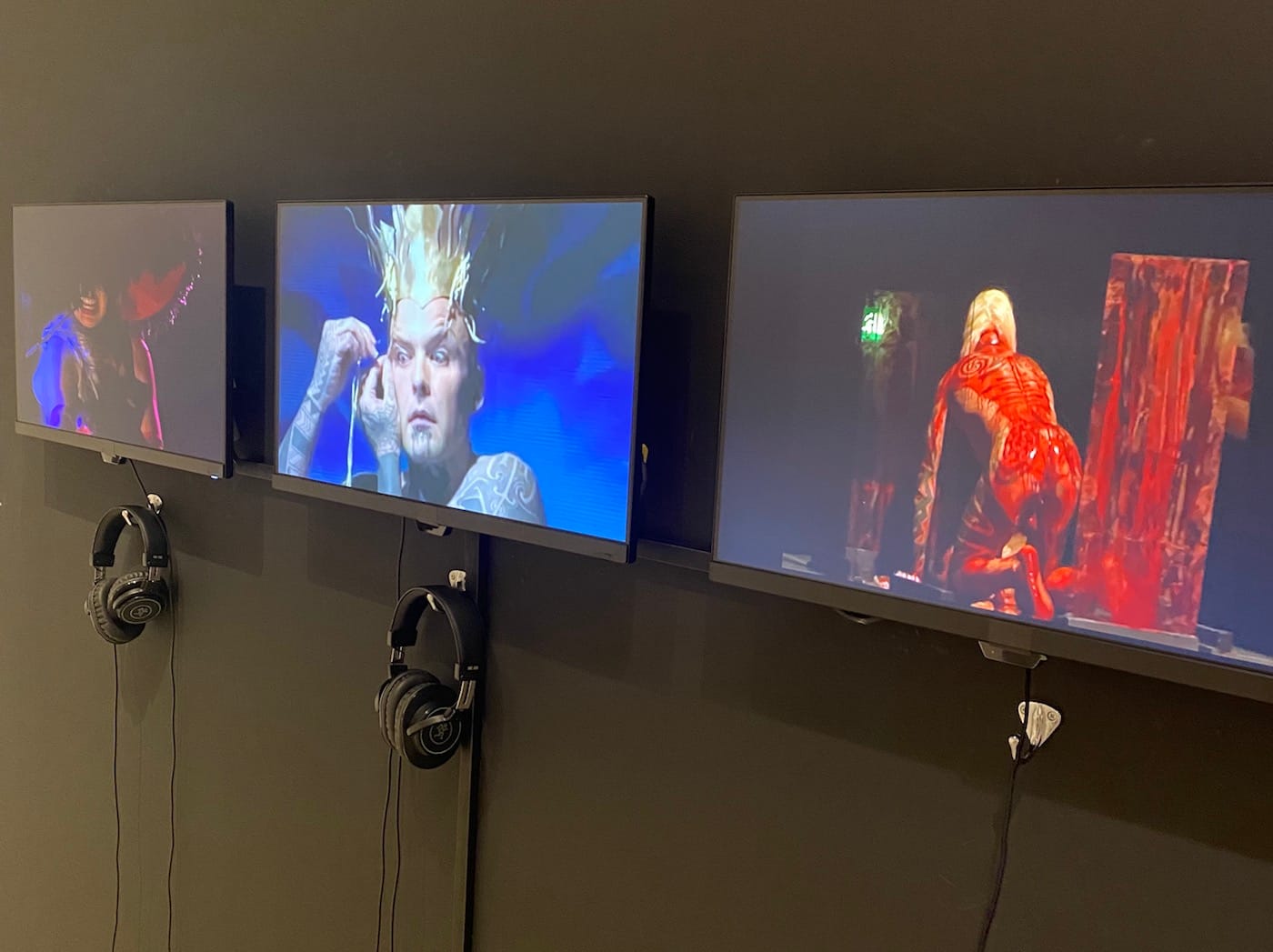 The five scenes range from a very stoic Athey standing at a lectern reading Bataille’s text on Nietzche and the horse of Turin, to the artist as disemboweled minotaur writhing in a pool of UV fluid wearing a bright red bull mask, his heavily tattooed, nude body glowing blue. “It's like a popped-out blacklight image. That's the oldest cheapest trick since the '70s,” Athey told me, “but all of sudden, you're in in a different reality.” In the last scene, Athey appears as a cephalophore — a decapitated saint who carries their own head — while a performer cuts his chest, pressing lengths of cloth onto the wounds and hanging them up.