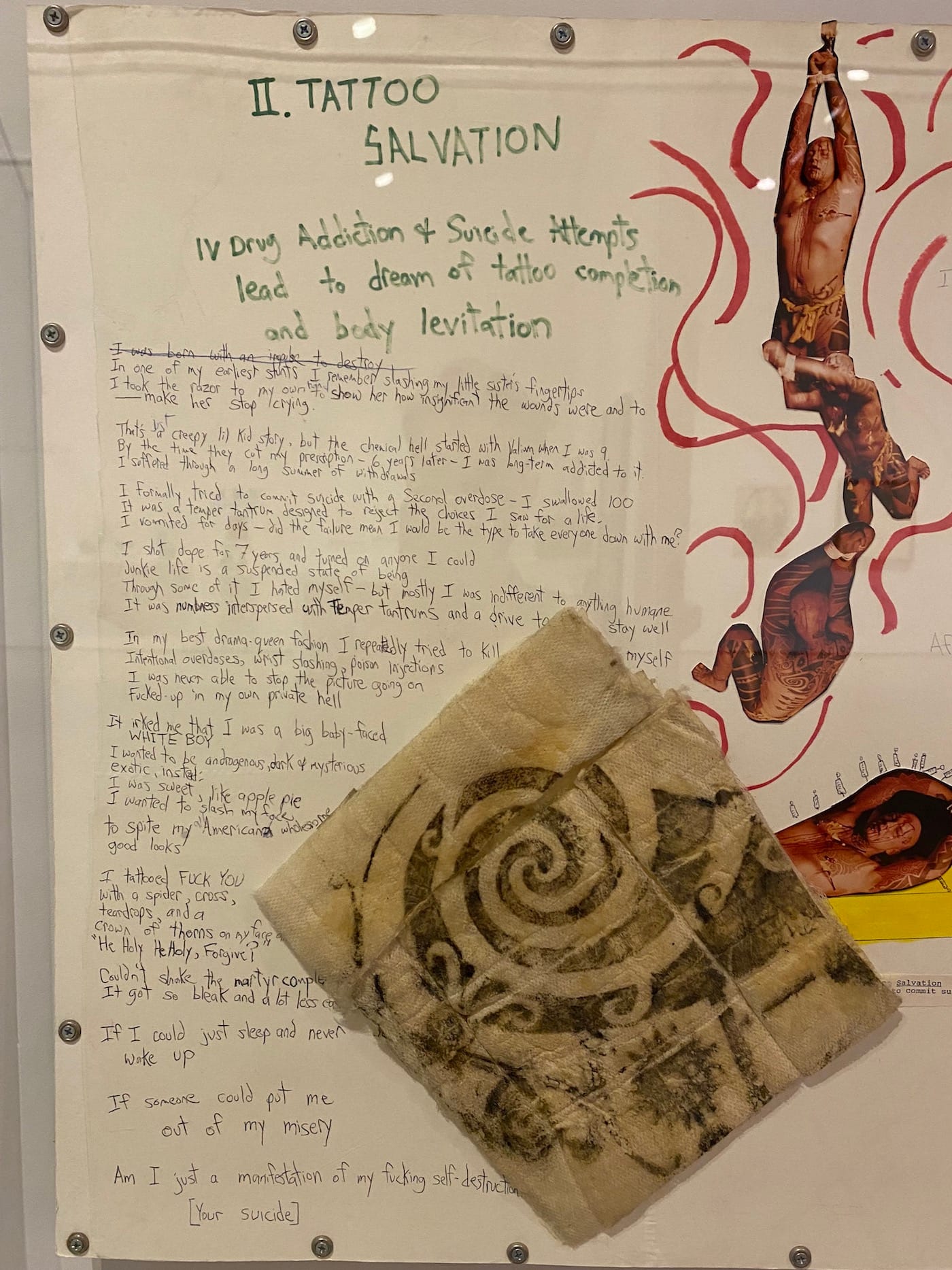 In addition to video and photos, “Four Scenes” is represented in Queer Communion by Athey’s storyboards, the only work in the show from the collection of a museum, namely the Walker. Composed of collaged images, drawings, and texts, the storyboards illuminate the nexus of references and meanings behind the work: black-clad leather daddies, Pentecostal preacher Aimee Semple McPherson, autobiographical accounts of his drug addiction and suicide attempts.