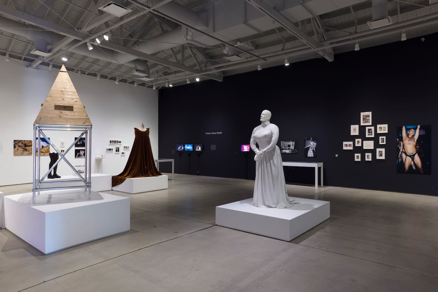 Seminal performances are represented through video excerpts, props, photos, and texts. These include “Judas Cradle” (2005), named for the pyramid-shaped medieval torture device which Athey perches upon, transforming it into a vehicle of queer eroticism, and “Solar Anus” (1999), a reinterpretation of Georges Bataille’s 1931 surrealist text in which Athey inserts a stiletto-heel dildo into his anus and dons a golden crown held in place with facial piercings.