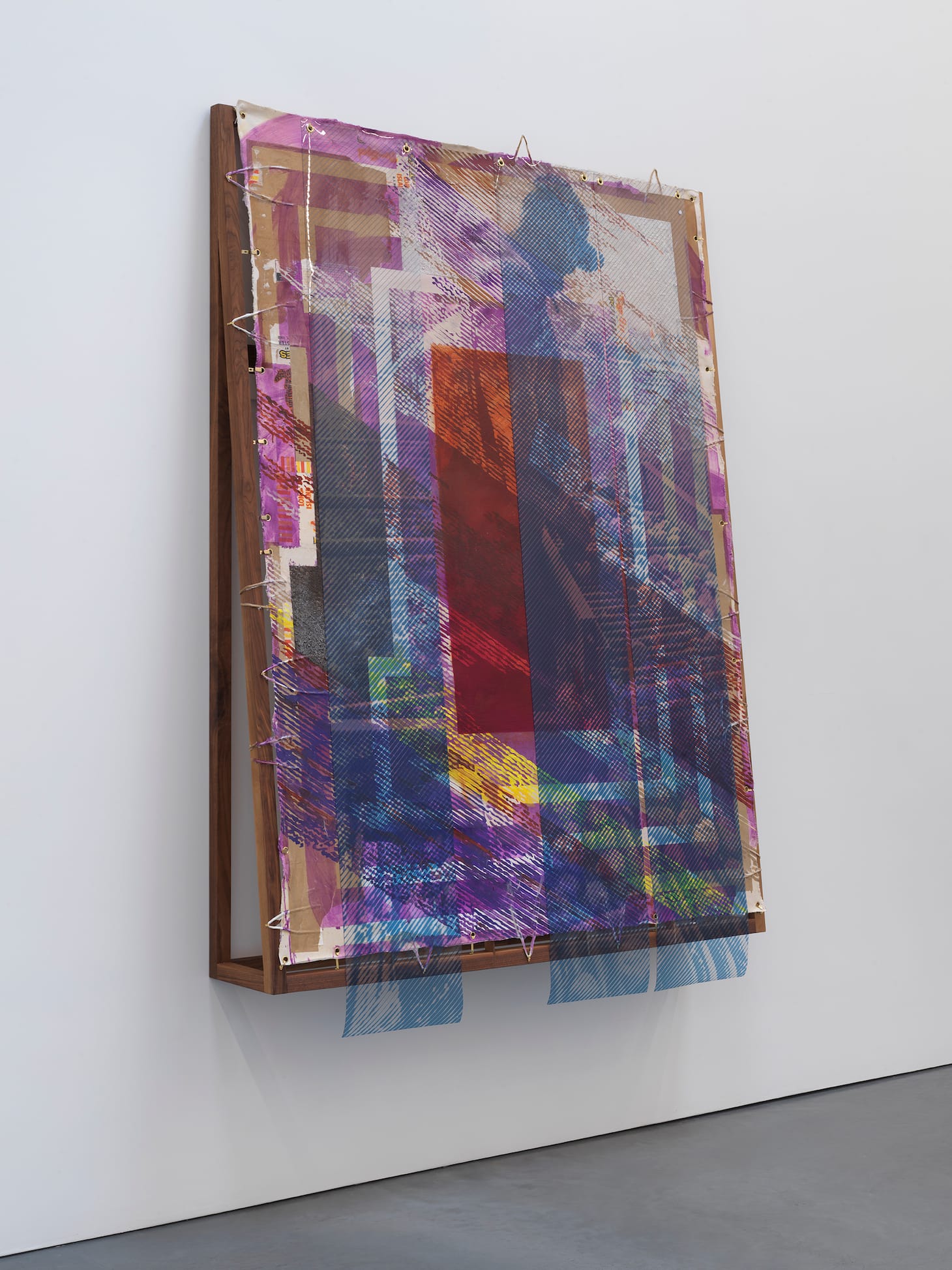 Jackson’s paintings employ locally sourced fabrics, potato bags, ground shells from a Shinnecock wampum carver, and soil from the museum’s site; potatoes were grown at the site, which was once a farm employing Black and Latin migrants. She paints historical photographic images in halftone lines and overlays them with images printed on transparent vinyl strips, the paintings framed in wood constructions by Ruben Palencia that extend out from the wall at the bottom.