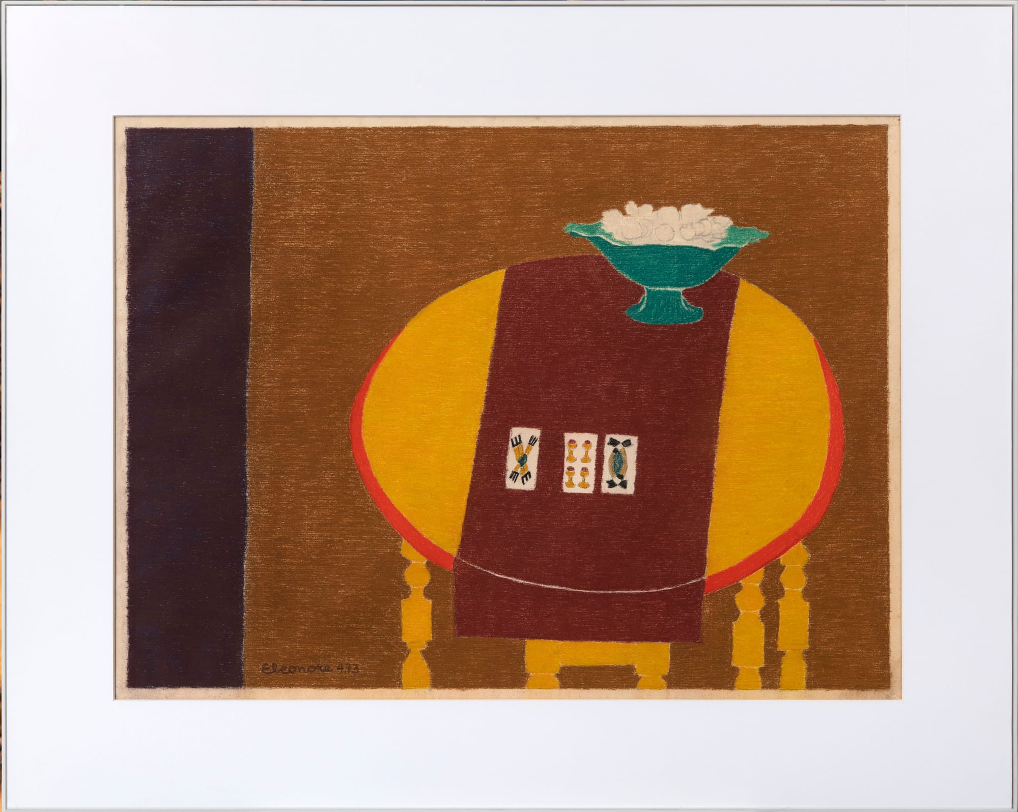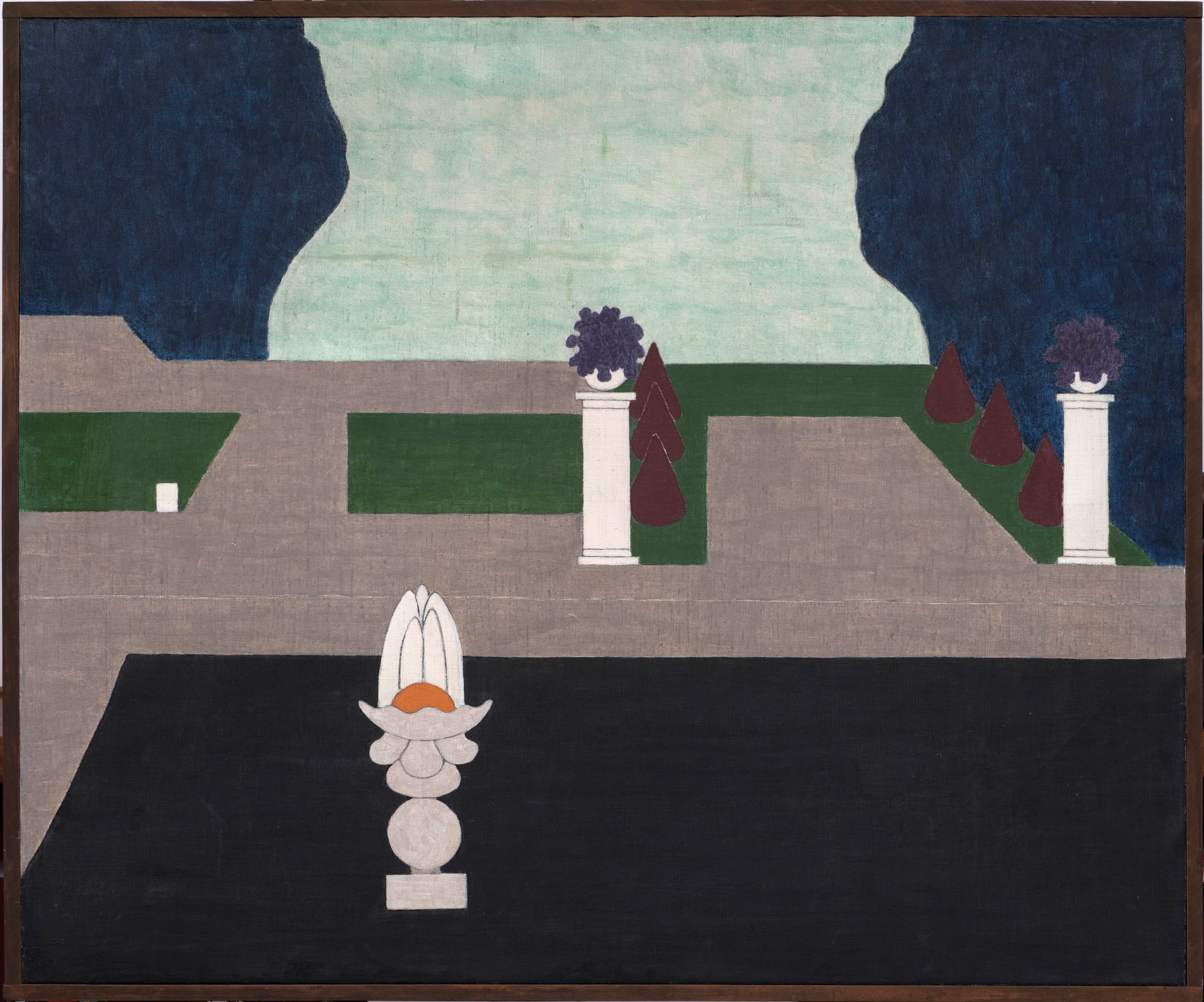 By contrast, Koch “came from a bourgeois background of German Jewish immigrants and had formal artistic training in Brazil and abroad,” Brunson noted. Although she absorbed elements of Volpi’s simplified forms and intense colors, Koch never left figuration behind. That decision would hinder her career in Brazil and eventually compel her move to London in 1968. Koch lived abroad for the next 20 years, painting quiet domestic scenes and imagined gardens inspired by England’s Neoclassical architecture. Despite their still, orderly feel, Koch’s sparse pictures of chairs, pedestals, and plants are searingly stark and subtly infused with feeling. By the 1990s, Koch had returned to Brazil. The paintings from this era exhibit a curious preoccupation with the canvas as a work space — shaped and modeled as a desktop — where writing artifacts like ink blotters and crumpled paper appear again and again.