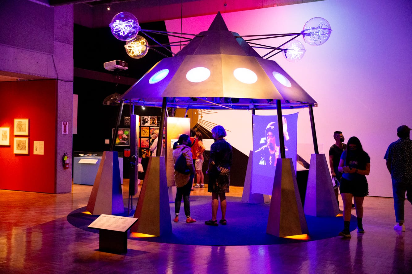 In “Sonic Freedom,” visitors have the opportunity to enter the Mothership itself, a replica of the flying-saucer prop that musician George Clinton used to make grand entrances at Parliament Funkadelic concerts in the 1970s and ’80s. Once inside, visitors can select from a playlist of 165 songs curated by DJ Spooky going all the way back to 1902. This bending of the space-time continuum extends with Space Is the Place, the 1970s Oakland-filmed movie starring avant-garde musician Sun Ra, projected on the wall behind an installation of Ruth E. Carter’s Dora Milaje costume for the women warriors in 2018 blockbuster movie Black Panther, set partially in Oakland.