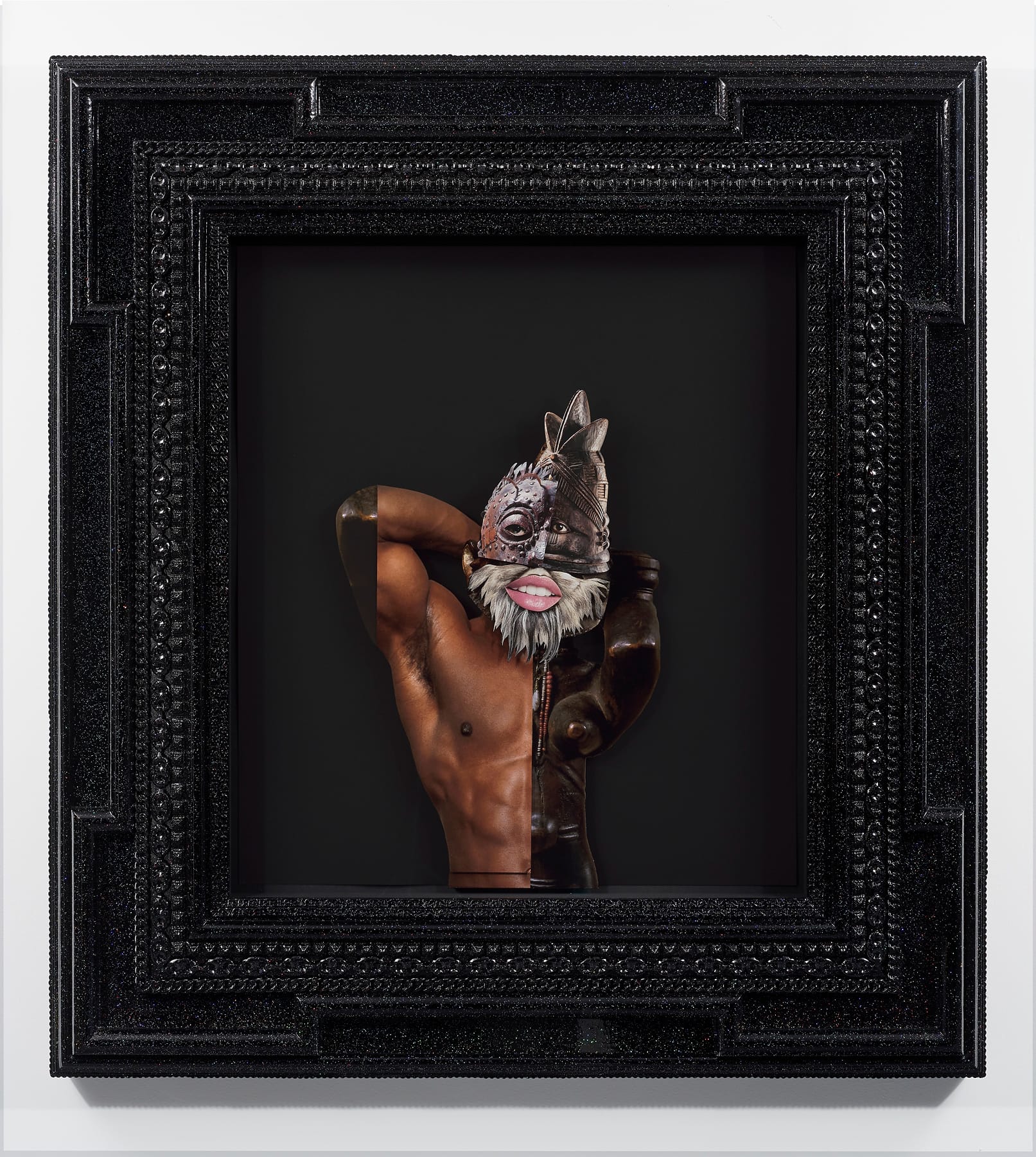 The next room, “Rebirth,” offers examples of assemblage, described by multidisciplinary artist Rashaad Newsome as “a method to construct a new cultural framework of power that does not find the oppression of others necessary.” A highlight is an entire wall designed by Newsome consisting of two collages created during lockdown, “Parenting While Black” and “Thirst Trap,” which piece together photographs of African masks and sculptures with male nudes to create seamless cyborg figures that reference Black and queer culture.