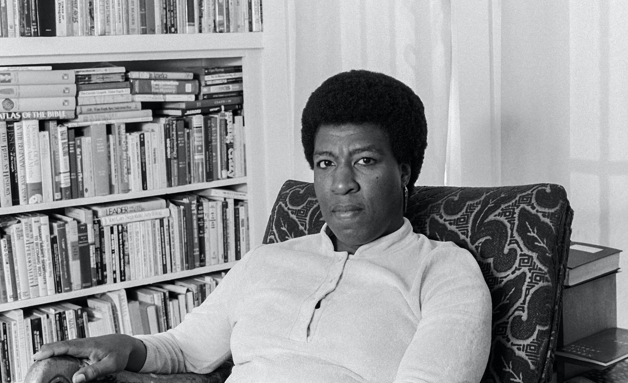 Crowds called to board the Mothership enter a dark room, accompanied by composer Nicole Mitchell’s sound installation, “Mothership Calling,” and are soon introduced to the mother of Afrofuturism, sci-fi author Octavia E. Butler. The visionary Butler, whose novels, stories, and essays reenvisioned traditional gender identity and seem to have predicted recent racial, environmental, and political events, embodies Afrofuturism’s feminist and queer principles. Her notebooks, highlighted in colored marker and peppered with exclamation points, are equally prescient in their urgings to Get Popular! and Make People Feel Things!!! Another important mother included in the gallery titled “Dawn” (the exhibition is organized into four sections, two of which take their titles from Butler’s work) is Henrietta Lacks, whose illegally obtained cells are the source of the immortalized HeLa line that has been used to study cancer, cell biology, genetics, and infectious diseases, including COVID-19.