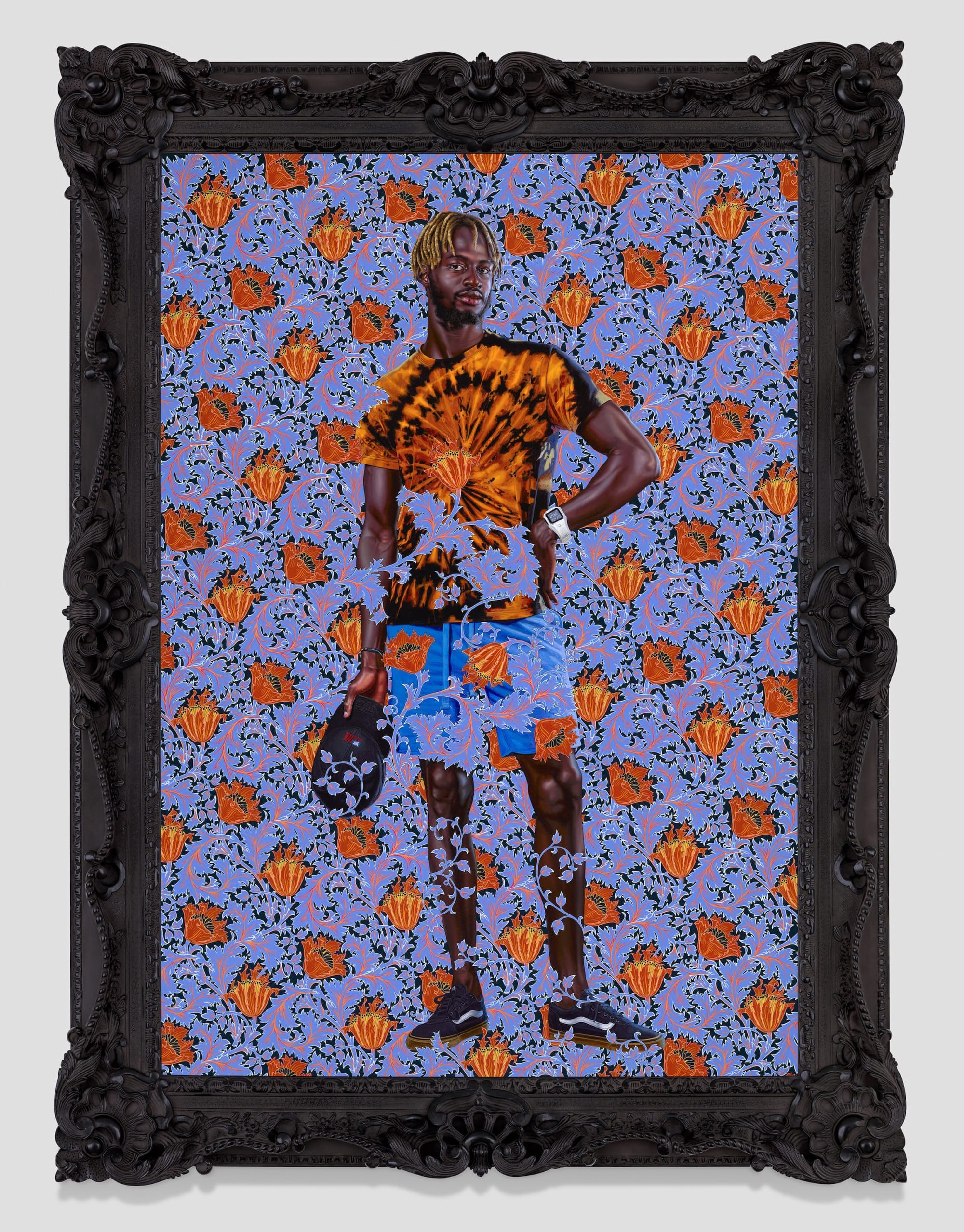 Upon taking a closer look, however, I changed my mind. Hung directly across from Gainsborough’s portrait, Wiley’s painting of an anonymous Senegalese man electrifies the room with its palette of shocking purples and oranges, set off against its ornate black matte frame. The figure’s pose is the same as the original, a casual contrapposto with one hand resting on his hip and the other hanging loose to the side, fingers holding onto the edges of his hat. His stance slightly wider, his gaze more confrontational than the Blue Boy’s more demure expression. Like the reference image, Wiley’s version is rendered with extreme technical precision and virtuosity. The only differences are apparently slight: the present-day clothing of the figure, the almost-psychedelic effect of the painting’s saturated hues, its decorative pattern creeping over the foreground. And, of course, the blackness of the figure. Which is to say, the difference is earth-shattering.