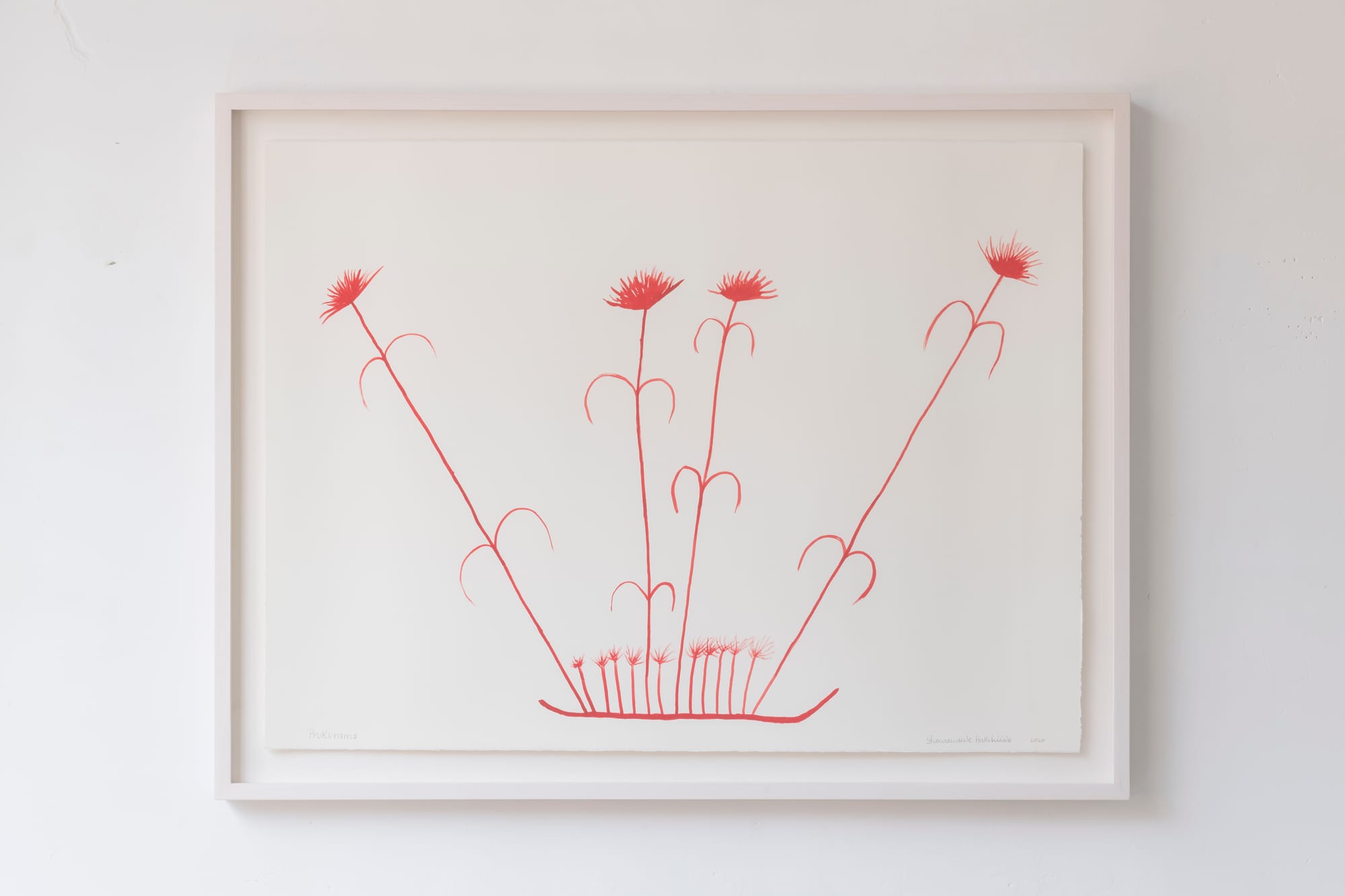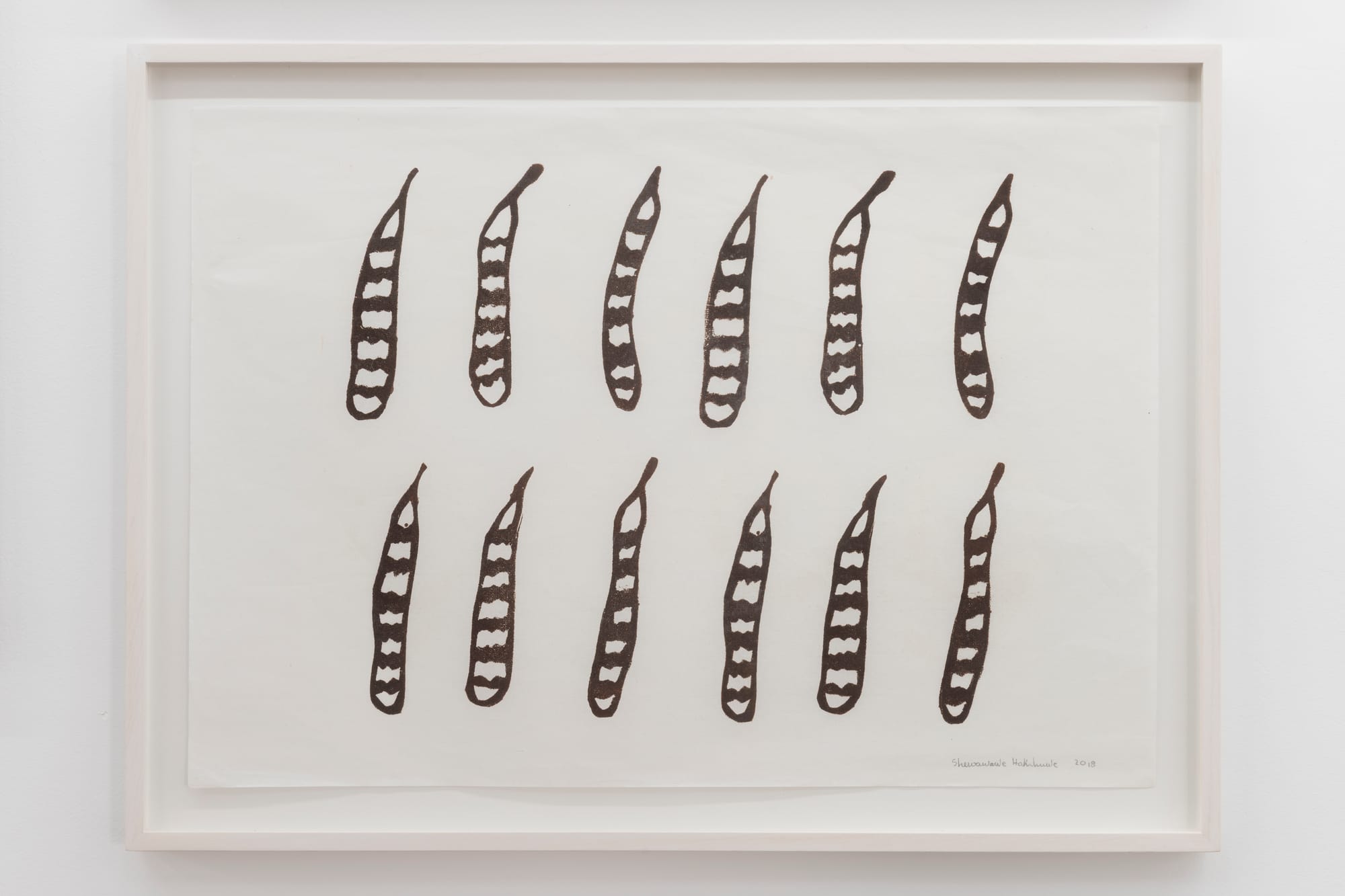 Sheroanawe Hakihiiwe’s drawings condense nature into a graceful, powerful essence. Hakihiiwe is an Indigenous Venezuelan artist who lives in Alto Orinoco. The subject of his drawings on handmade paper is the Amazon jungle where he lives, and its intricate and endangered ecosystem. Plants, insects, and other natural and supernatural phenomena appear in the artist’s succinct but sensitive works, which also pull from the visual traditions of the Yanomami people. With assured lines and a steady hand, Hakihiiwe draws from his community and his surroundings with piercing clarity.