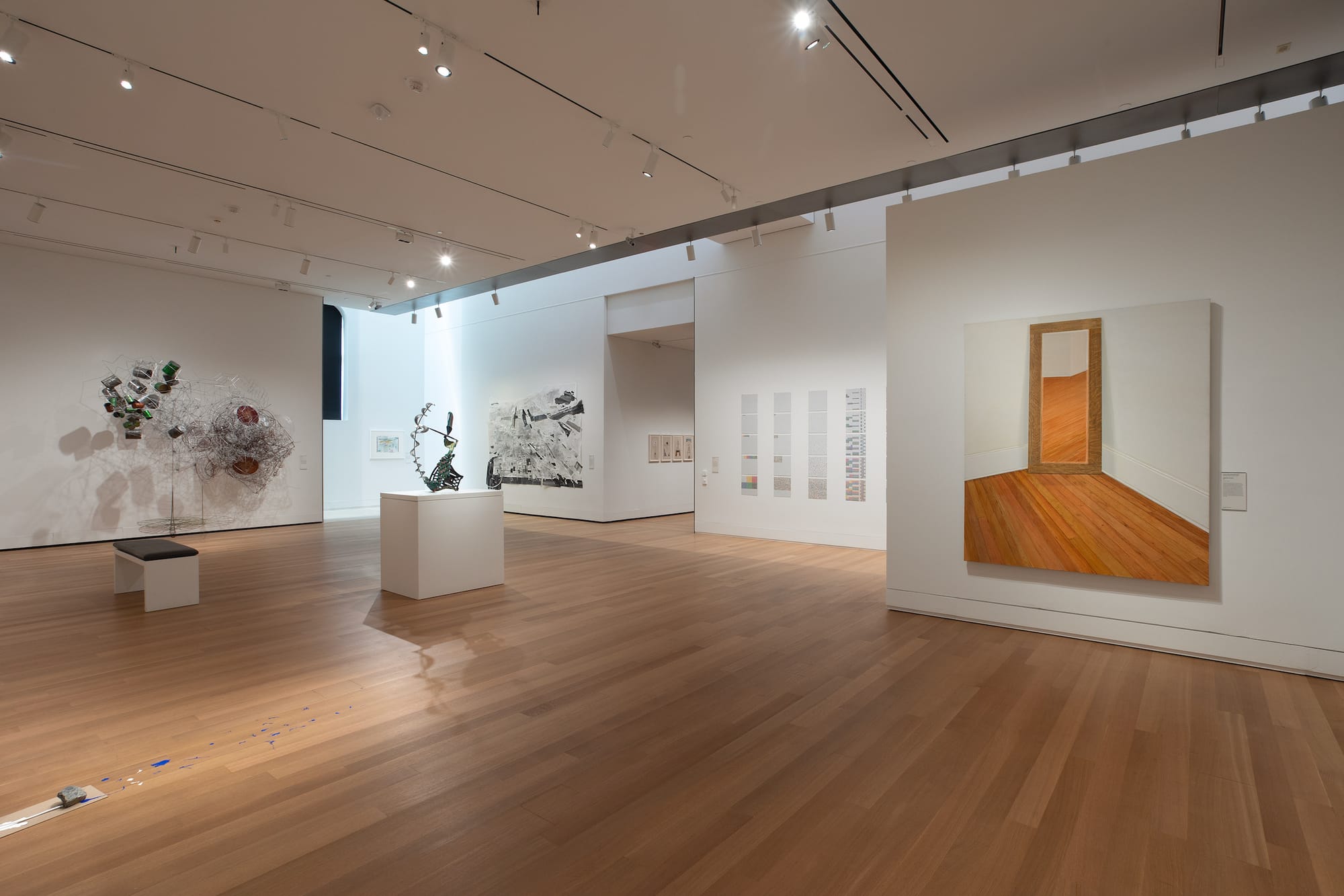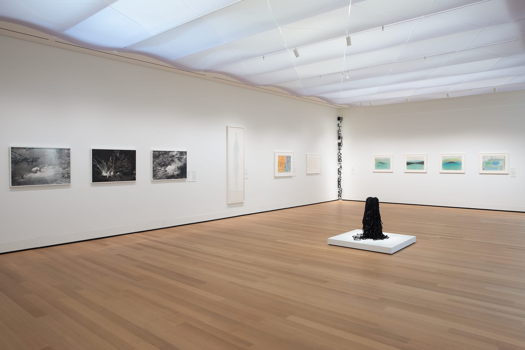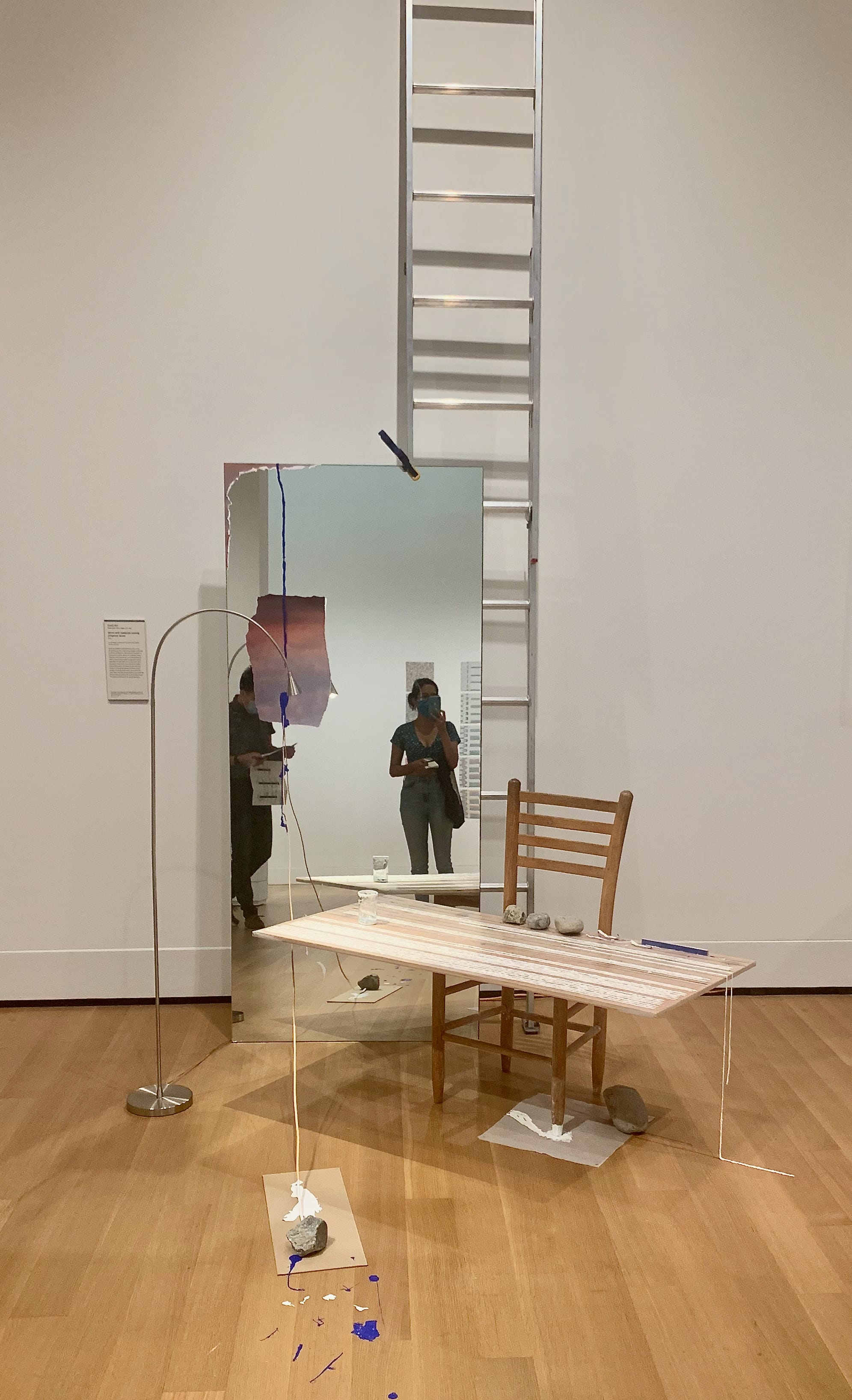 Sarah Sze’s “Mirror with Landscape Leaning (Fragment Series)” (2015) in the “Sculpting Space and Place” room, poses a fundamental challenge to this question. When you look at artwork — a mirror amidst a landscape of furniture, string, and paint splattered directly onto the floor — you’re looking at yourself. If you’re not careful, you might even step on a pearl of hardened blue paint. Sze’s work is a provocation; she makes us become part of the work. So does Howardena Pindell, a floor away in “Casting History, Etching Memory” with a lithograph of a churning mass of color and lines. The shapes seem to move as you draw nearer, morphing from fish in a sea of orange and blue into layers of tiny arrows circling inwards. I was mesmerized. Then I saw the title: “Katrina Footprint” (2005–7). Though separated by walls, the pieces are linked in their dynamism and in their own ways, force you to ask yourself: why can’t I look away?