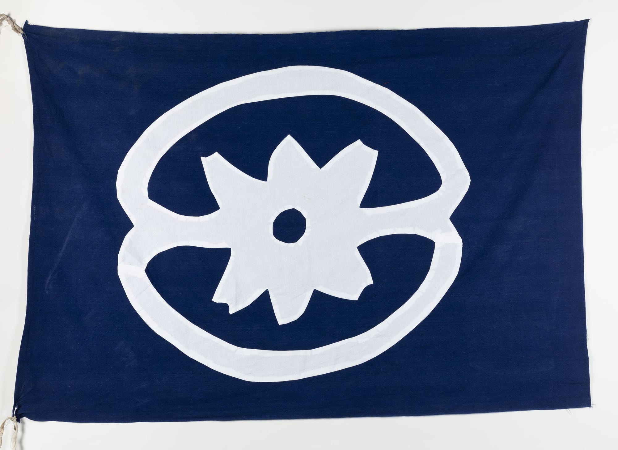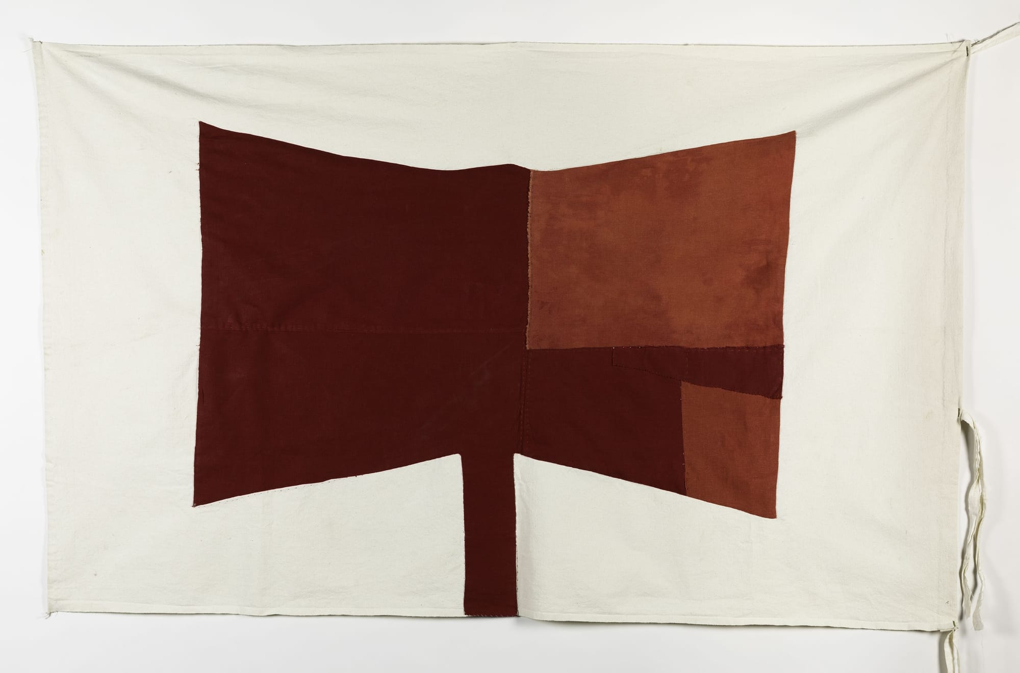 The community-engaged performance doesn’t recreate violence. Instead, the performers imagine a nation built by the formerly enslaved by waving flags, familiar symbols of independent statehood. At the time of the rebellion documenters noted that the rebels had flags, but did not see the importance of describing them or investigating their meaning. Scott, along with the costuming team, used existing knowledge about the religious customs and symbols of the enslaved tribes brought into the Louisiana Territory from Congo, Angola, Yoruba, Ibo, and other West African regions, as well as Haiti and other parts of the United States, to speculate. What symbols would an army of rebels carry on its way to freedom? The one flag on view, “Army of the Enslaved Flag (Ogun),” is a grass-colored fabric with white and black triangles bordering the longer ends of the rectangle, with a stylized machete in the center. The machete is also a sword: both the tool of their enslavement and a weapon of Ogun, an Orisha followed by warriors. Like the other images from the performance, it’s simple yet powerfully suggestive of various layers of meaning.