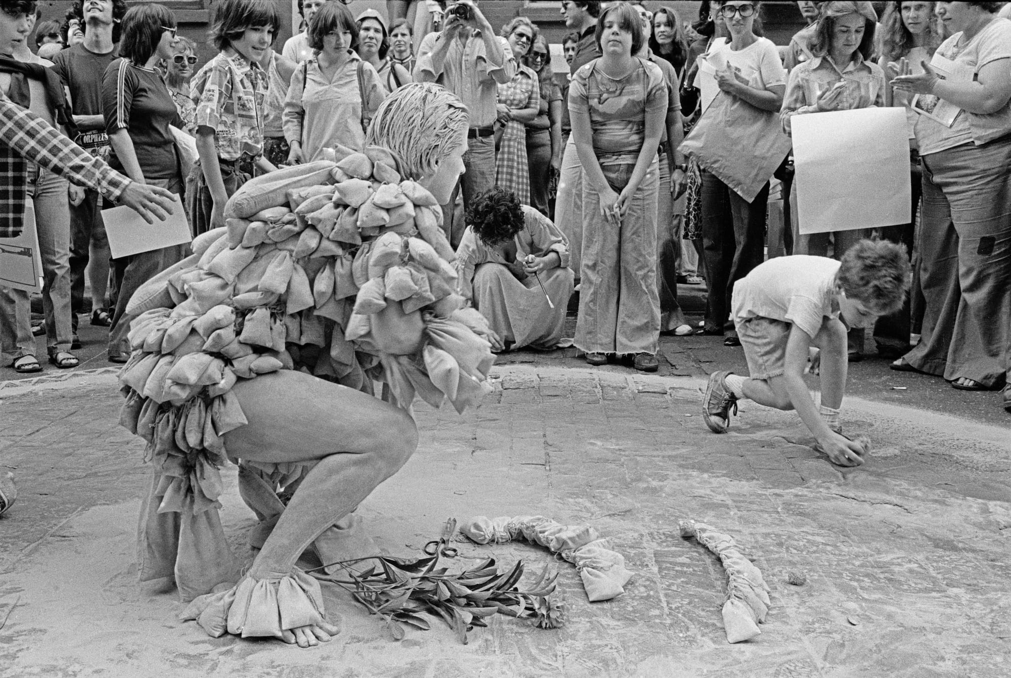 Betsy Damon, “7,000 Year Old Woman” performance on Prince Street, New York, (May 21, 1977), archival print (©Betsy Damon 1977/2021, courtesy the artist)