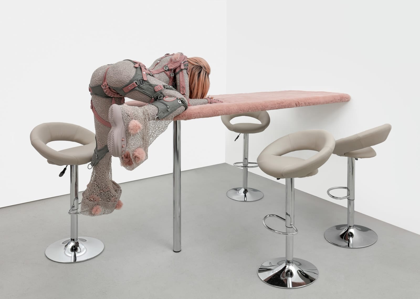 Those meanings are rooted in a response to consumer culture through which Uddenberg explores representation and the female body as it has evolved with technology. In her world, the physical bodies of her sculptures are not the only thing made from those “layers of references.” She also views sexuality and gender as fluid and malleable, influenced by what she defines as “rampant consumerism” and the over-saturated world of social media. It’s no wonder that as her portfolio has grown, so too have certain body parts on her sculptures. It also makes sense that with each new series, her sculptures are outfitted with more technology — an iPhone here, a selfie stick there — and that their compositions look more and more like sex robots. Her works are an eerie representation of identity and sexuality in the age of self-representation: the ultimate pastiche, a collage of memes, pop culture references, and nods to our Saved folders, filtered (literally) through technology.