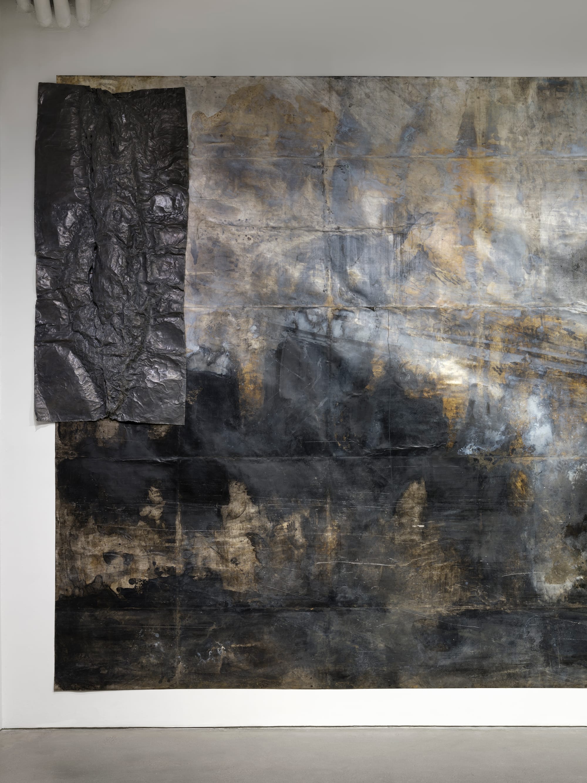 The most direct representations in In the Wake of… can be found in the eight-channel sound piece, a projection of individual construction and subway noises, and in the lead casts affixed to the drawing like oversized band-aids. Both installation elements are realistic in their own right yet, in context, function as part of an unmistakably fictional composite. In the Wake of… calls attention to the vestiges of its own fabrication, from the gridded fold marks visible in its drawing paper to its reduction of the urban soundscape into isolated rumbles and drones. Like the sedimentary records they evoke, LaTocha’s drawings are a beguiling mix of intent and accident, specificity and abstraction, human reminders of inhuman oblivion.