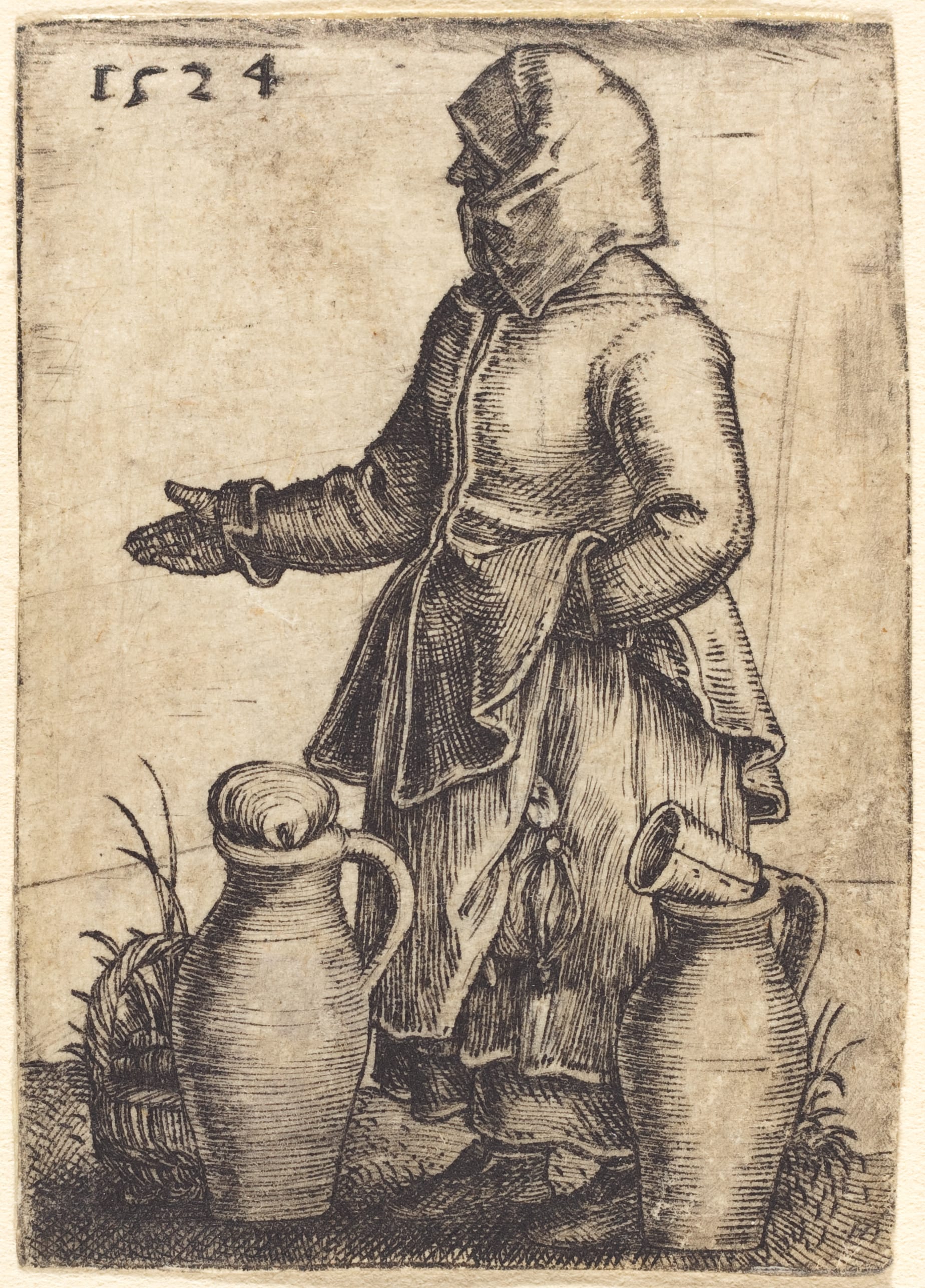 Beham and his brother, Barthel, drew influence from master engraver Albrecht Dürer, who depicted peasants in scenes of celebration. Dürer’s engravings worked against classist stereotypes that associated poverty with sin, but he retained weathered facial features, exemplifying what Jürgen Müller calls “aesthetic subversion.” The Beham brothers went a step further, producing anti-church woodcuts in Nuremberg broadsheets, including The Pope’s Descent into Hell and Allegory of Monasticism, which shows a monk turning his back on the personification of poverty in favor of pride and luxury.