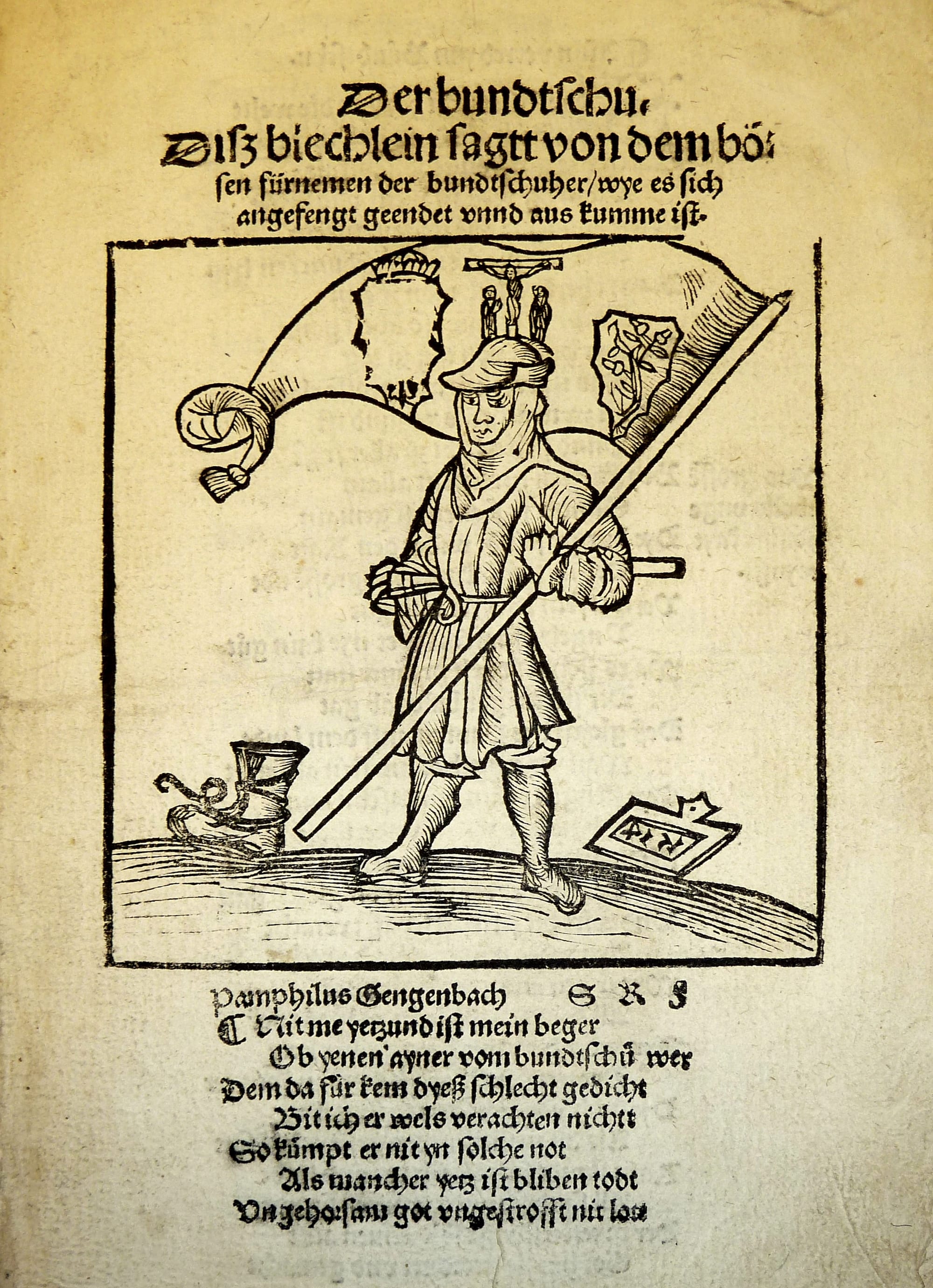 The spread of humanist writing coincided with spontaneous uprisings of the Bundschuh (“Union Shoe”) movement, referring to leather boots worn by rural populations since the Middle Ages. An outpouring of Bundschuh pamphlets attacked privileges of upper estates in favor of the gemeinen mann, or common man. Peasants, artisans, and citydwellers represented common sense, religious devotion, and proud work, contrasting with orthodox critics of Luther working largely in satire. The Bundschuh symbol was painted and embroidered onto flags carried by rebels, often with the slogan “Lord, stand by Thy divine justice,” and appeared in pamphlets either promoting or condemning them.