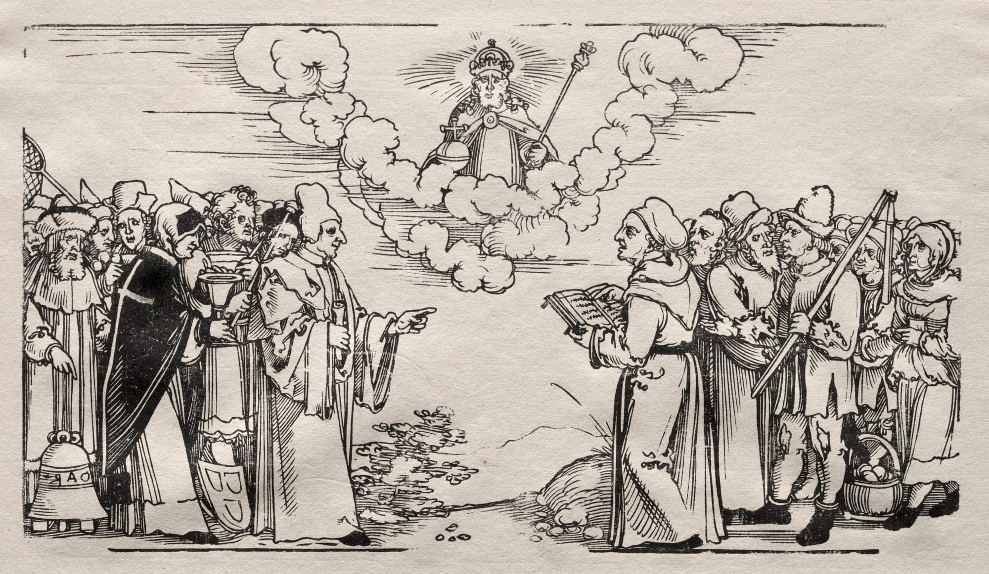 Martin Luther used print to his advantage, particularly with his 95 Theses opposing the sale of indulgences. As the princes aligned with the Pope, Luther advocated for secular reform by appealing to the downtrodden classes. In artworks, early Lutherans like Hans Holbein and Lucas Cranach lionized him as a Herculean savior against the church’s abuses of power. Early publications likewise portrayed Luther facing off with Christians, as in Hans Sebald Beham’s “Dispute Between Luther and a Theologian” (c. 16th century). Luther leads a crowd of artisans and farmers, representing working-class grievances.