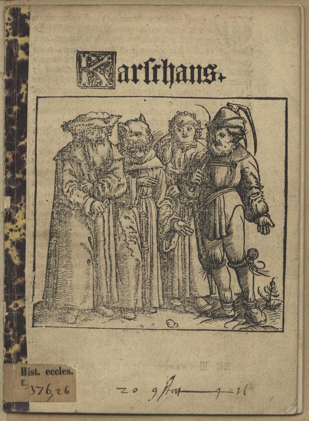 Bundschuh literature garnered broad support from artisans, with Dürer even creating a woodcut of Black Forest insurgent leader Joss Fritz. The 1521 publication of the anonymous pamphlet Karsthans, or “Hans of the Hoe,” introduced the archetype of a commoner named Hans holding a two-pronged hoe. Subsequent publications show him carrying a flail beside the slogan Fryhans, or “Free Hans.” In woodcuts by Hans Weiditz and Hans Leonhard Schäufelein, peasants eschew their haggard appearance in battle scenes with armored knights. By 1525, when uprisings overtook Swabia and Franconia, popular depictions blurred the distinction between the peasants and the noblemen.