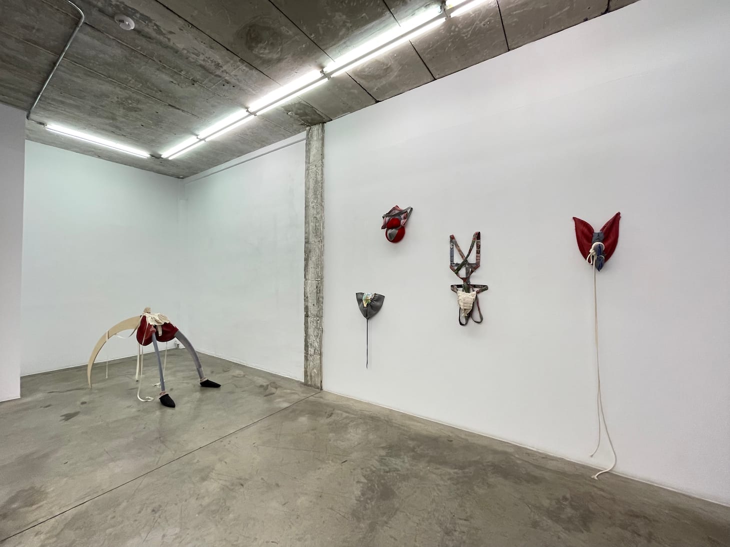 Soft wall sculptures poke fun at codpieces, the 16th-century garments for male genitals that asserted manhood. Red bulbous forms slouch; chainmail-like knits reveal their softness up close. These carnivalesque symbols of masculinity seem to hunger for corporeality, like the wood sculpture in the gallery center evoking a human bent backwards and clad in bizarre underwear. De Erauso’s slippage between garments and identities is an ephemeral act that challenges the colonial authority of visual and written evidence, but her creative performance of masculinity oppressed African and Indigenous peoples. Azpilicueta’s feminist commitments to marginalized histories bypass race, while the humor in her work humbles masculinity’s defenses, its claims to body, territory, and history as property.