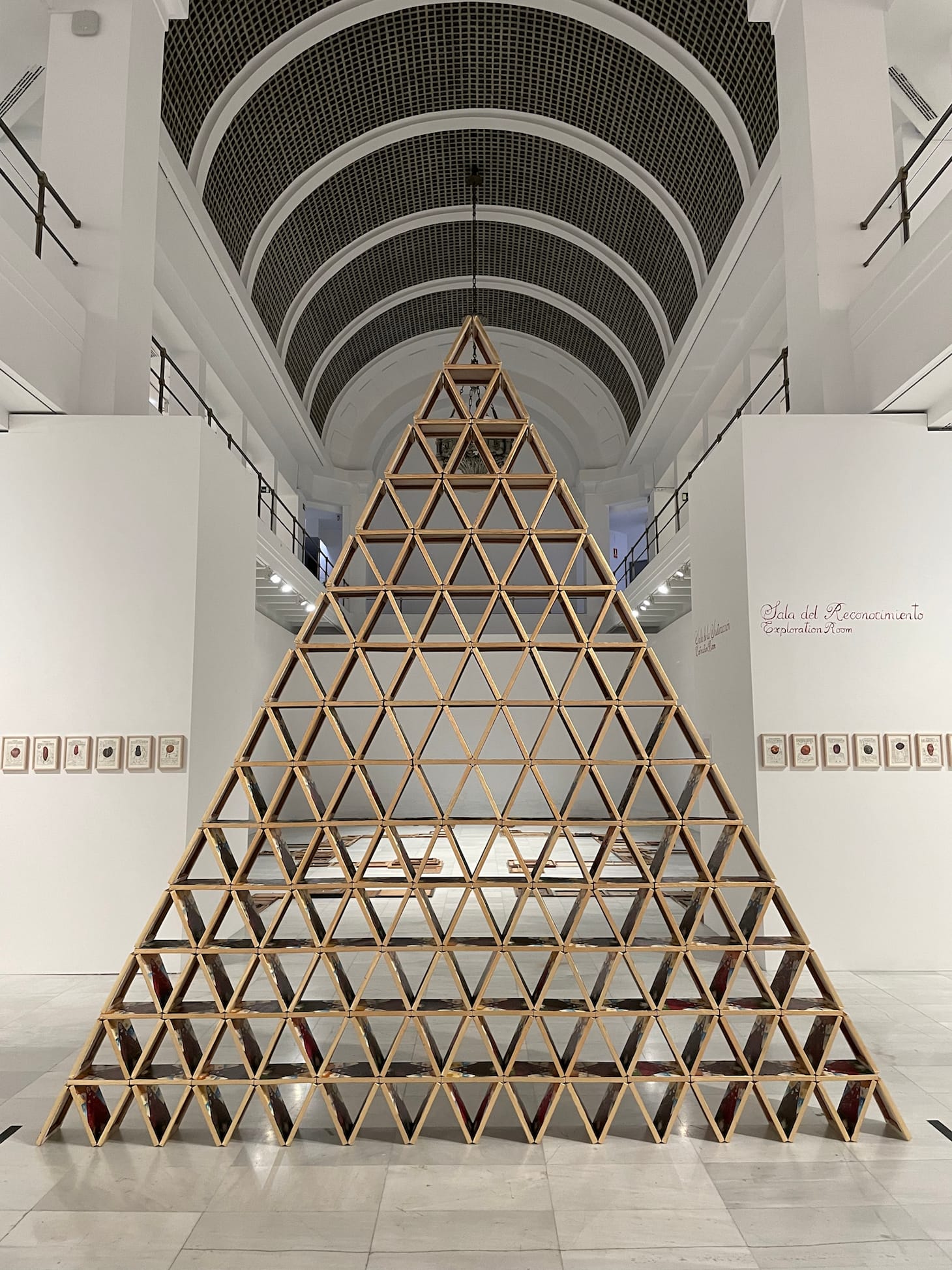 Unlike Tornaviaje, Katalina, and other exhibitions by Spanish and Latin American artists, Buen Gobierno was excluded from the city’s Hispanidad program. The artist also complied with a request from the Culture Ministry of Madrid, which funded the exhibition, to remove the words “racism” and “restitution” from the entrance text. Such censorship suggests how contemporary art can attempt to confront colonial violence and cultural exchange, rather than justifying the former with the latter. The excised words echo in the empty spaces of Gamarra Heshiki’s art, amplifying their critique of erasure. In Chakana (2015-21), flea market paintings overturned on the floor of the northern apse form Andean crosses that embody the interdependent forces of the universe. Shadowy brushstrokes on blank walls project the patterns into the distance, evoking the grounds of desecrated sites. We may wander into the centers, which invite us, from sacred points of union, to meditate on loss.