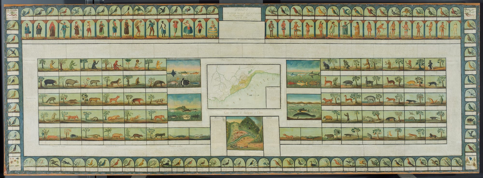 The Arobes join a sampling of representations of peoples of the Americas, allowing viewers to visualize social classifications while glossing over their continued enforcement. Mexican casta paintings foreground the valuing of Spanish blood over Indigeneity and Blackness. José Ignacio Lecuanda’s 1799 tableaux of Peruvian society further plots race and animal species by economic value. Drawings grid cities; a painting of a sprawling plaza exudes calm. Like a queen’s magic mirror, art reflected colonial desires to control unfamiliar but resource-rich colonies.