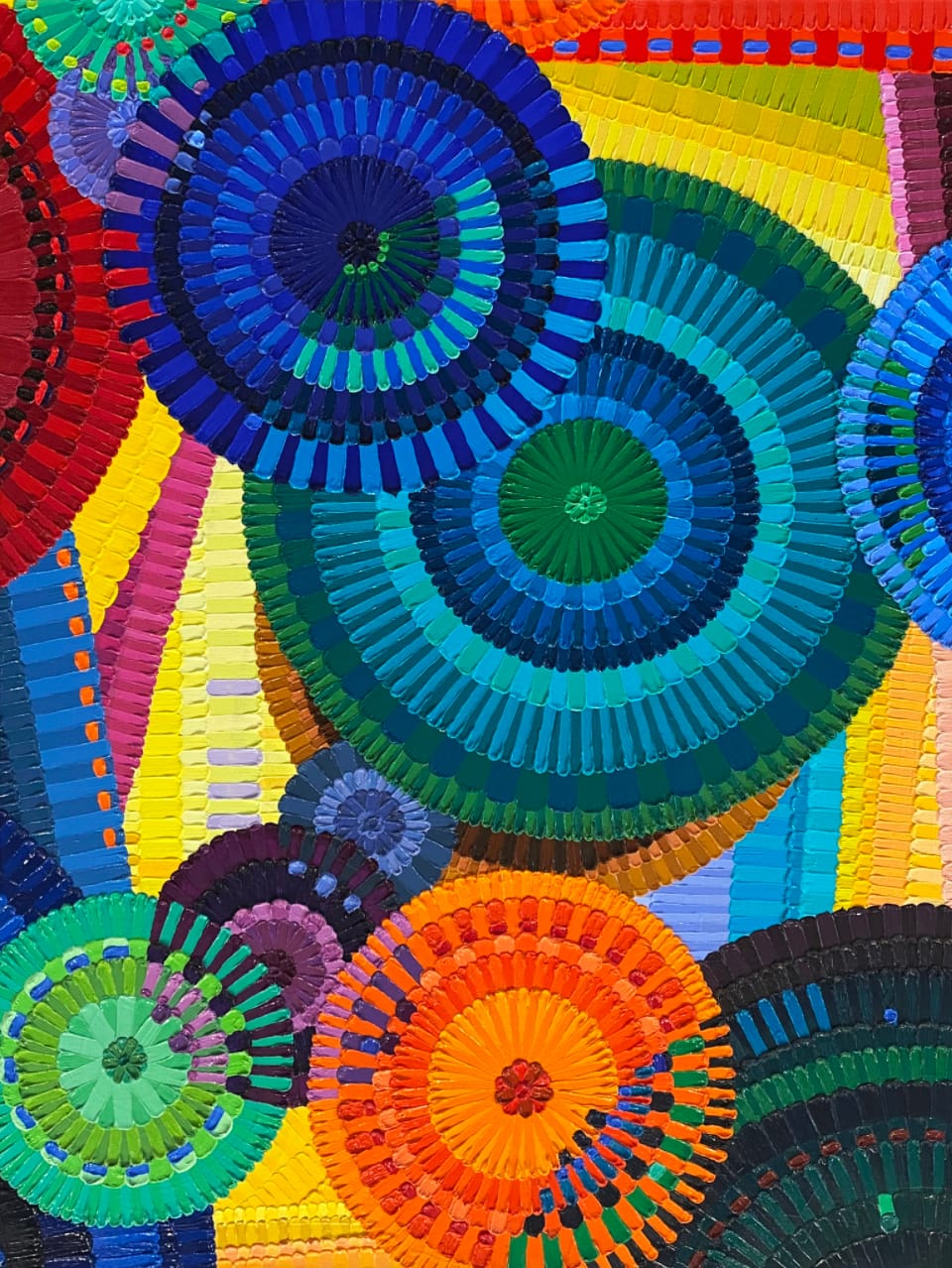 “With the black and white [drawings] I really tried to get in a place where there was no figuration and the drawings were only about an idea, whatever it was at the time, or an emotion,” Edmonds said. As she began introducing color, her painting process slowed down and her focus shifted to “creating ... energetic compositions with just line and movement and shape and value.” This pensive approach gave Edmonds the space to explore how color, movement, and repetition could double as gateways to spiritual introspection and personal connection. These experiments eventually developed into her circle series, or Energy Wheels