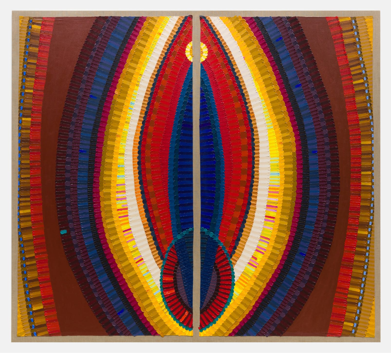 Los Angeles-based painter June Edmonds takes inspiration from the multiple inflections of the vesica pisces. Known for her large, abstract paintings depicting vibrant energetic wheels and neutral flags, Edmonds draws upon her meditation practice and American history — often highlighting the undertold chronicles of Black Americans — to create works that slow the viewer down, encouraging us to contemplate the myriad energies (and histories) coursing all around us.