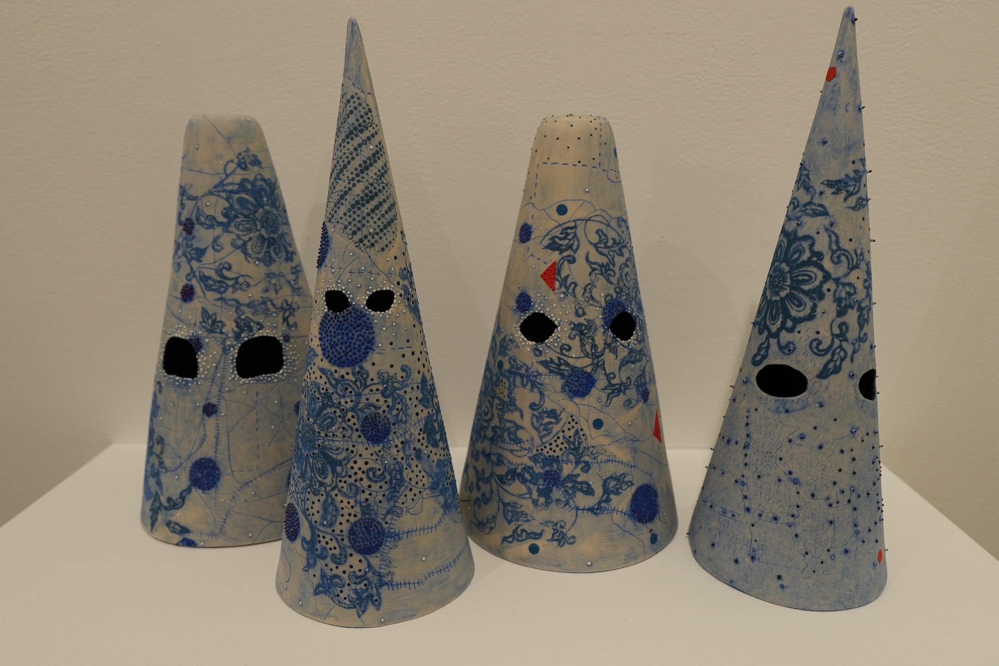 Tammie Rubin’s Always & Forever (forever, ever) series is on full display at this one-person exhibition in Chelsea that pushes the forms that evoke household objects in addition to KKK hoods, dunce caps, religious costumes, funnels, and other associations. The forms Rubin adds to the surfaces can denote maps, insignias, and various abstract patterns. The eyes in her funnels add to the mystery and convey a sense that the work is standing witness to something just beyond our gaze, or altogether invisible to us. The fan objects and drawings add to the larger vision here, and my only wish was to see a few larger objects that would anchor the gallery, but maybe I’m just eager to see more from Rubin. —HV