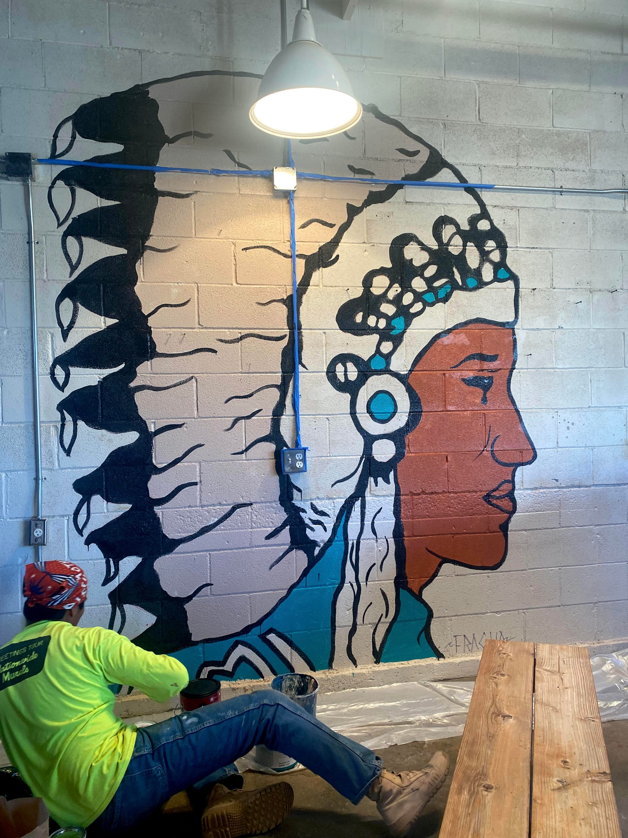 The two felt that this image, especially in the context of Platero’s work, would be a succinct encapsulation of the society-wide misapprehension around indigenous identities. She says the mural has organically inspired challenging, rewarding conversations with visitors to her shop, who might be troubled or confused by the incongruity of such a regionally inappropriate, clichéd image — conversations that only fuel her practice. For once, what’s good for her community is also good for business.