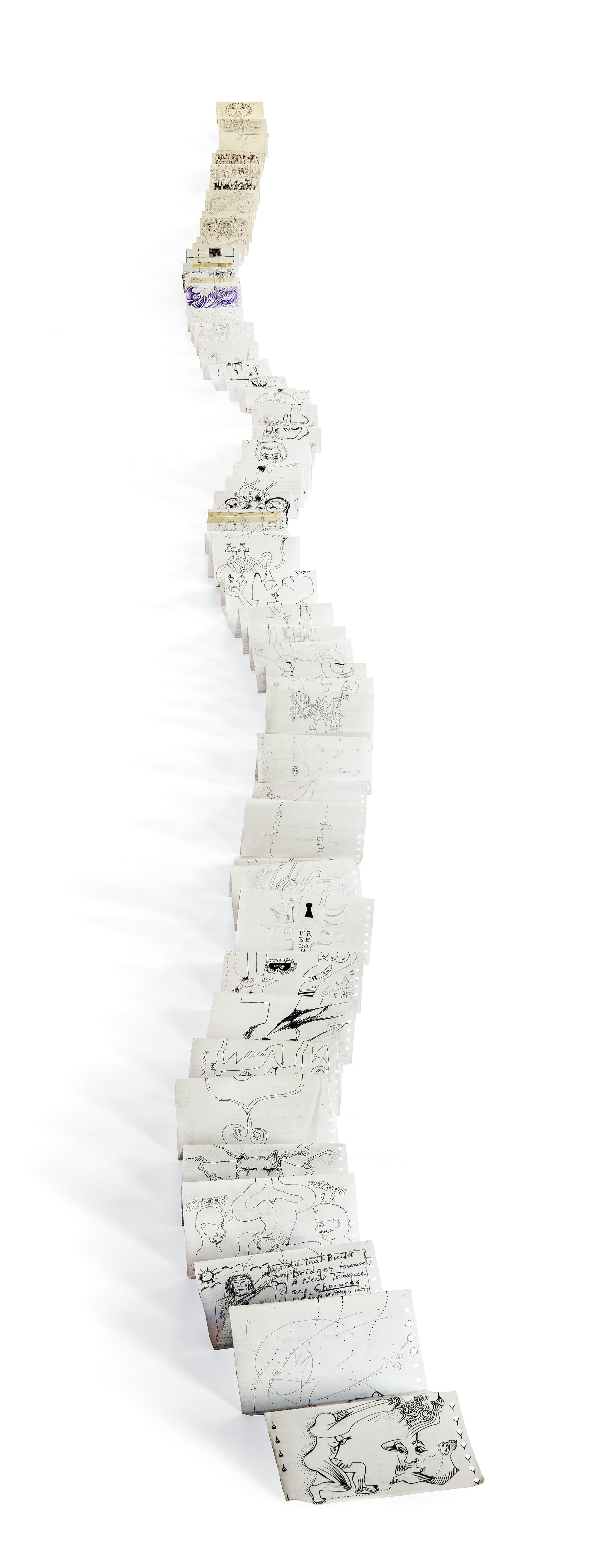 The inexhaustibly fascinating Ted Joans — an African-American artist, passionate advocate of pan-Africanism, and self-styled Surrealist jazz poet — is well-represented by a section given over to his collages, which marry Max Ernst and Romare Bearden. Also in the section devoted to Joans is his cadavre exquis (exquisite corpse) “Long Distance” (1976–2005), a 30-foot-long collaborative drawing, 30 years in the making, which includes contributions by William S. Burroughs, Ishmael Reed, Dorothea Tanning, and Amiri Baraka.