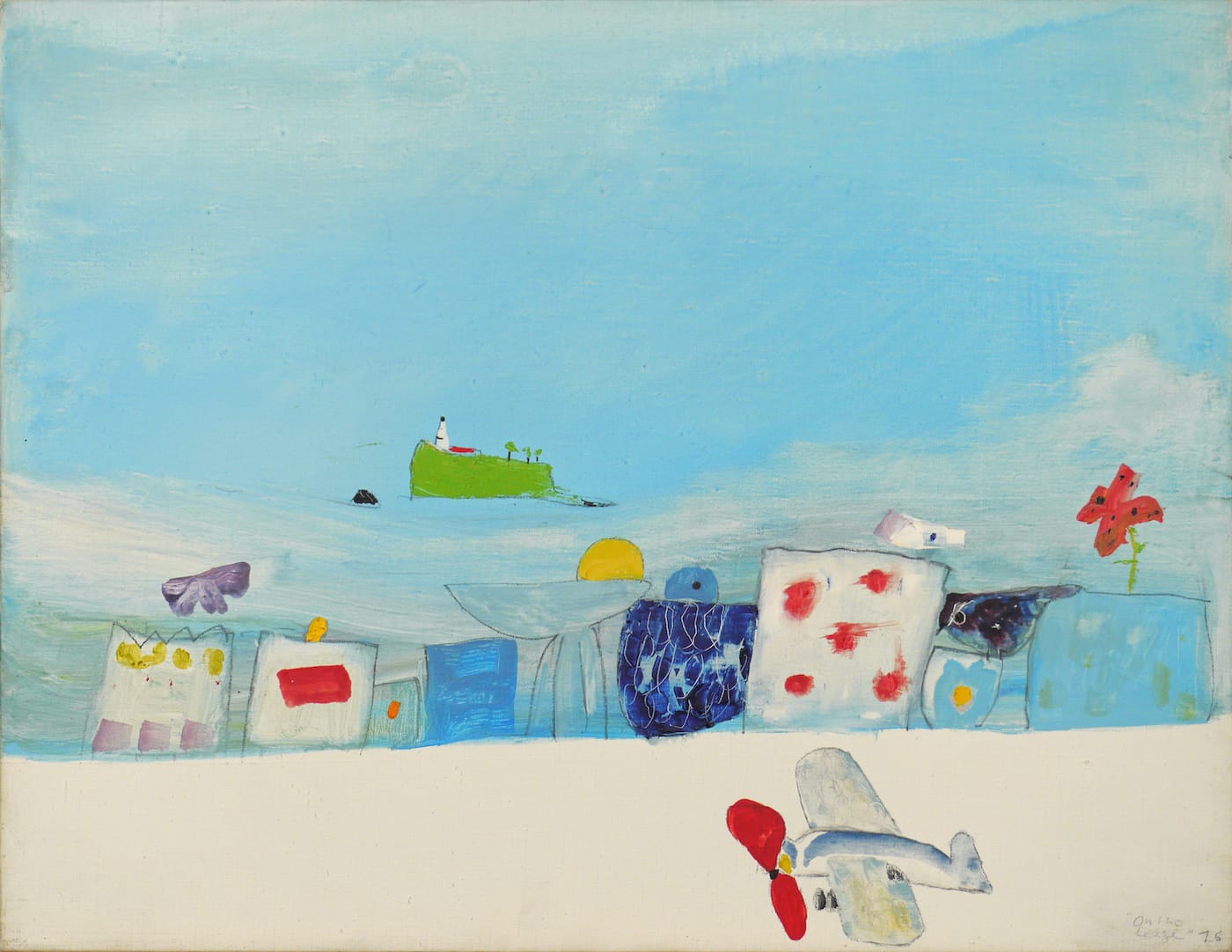 Schloss is far from deserving to be a nameless extra, though. Her work was varied and imaginative, ranging from boxed assemblages to brightly colored landscapes and abstractions. In reading her (loosely organized) recollections of living at 116 West 21st Street in Chelsea’s heyday, you discover that she also knew everyone and participated in big moments. She was at the afterparty for Willem de Kooning’s first-ever solo show, in 1948, when he still had zero buyers or reviews; she dressed up in matching pasteurized cow outfits with Meret Oppenheim for the 1951 Basel carnival and they won the costume contest; she met Nikki de Saint Phalle when she still went by ‘Mrs. Matthews’; when Marisol famously wore a mask to a 1961 panel talk at the Artists’ Club, she had agreed to go because Schloss wore a mask in camaraderie (although hers was a Halloween one, not the white Japanese mask that boosted Marisol’s legendary status).