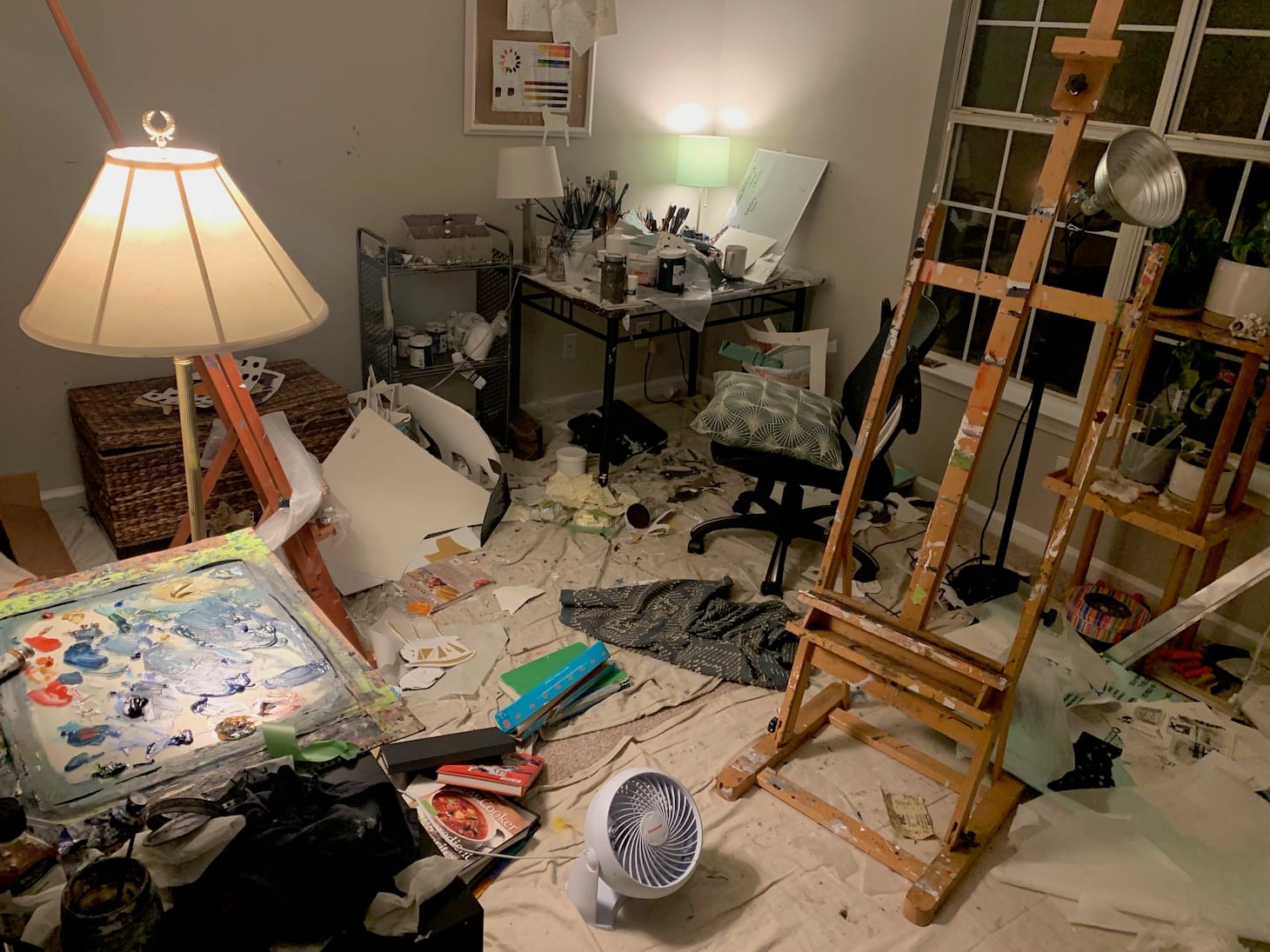 Here, oh here, is my unedited, un-Instagram-worthy, artist playpen during times of quarantine. Back in February of 2020, I got home from hanging 19 paintings and 19 cut-outs in a solo show, walked in my studio, and turned on the light. This is what I saw — I burst into laughter. Why? Well, I paint rooms and furniture, so I study how private, interior spaces often reflect psychological states and behavioral choices.