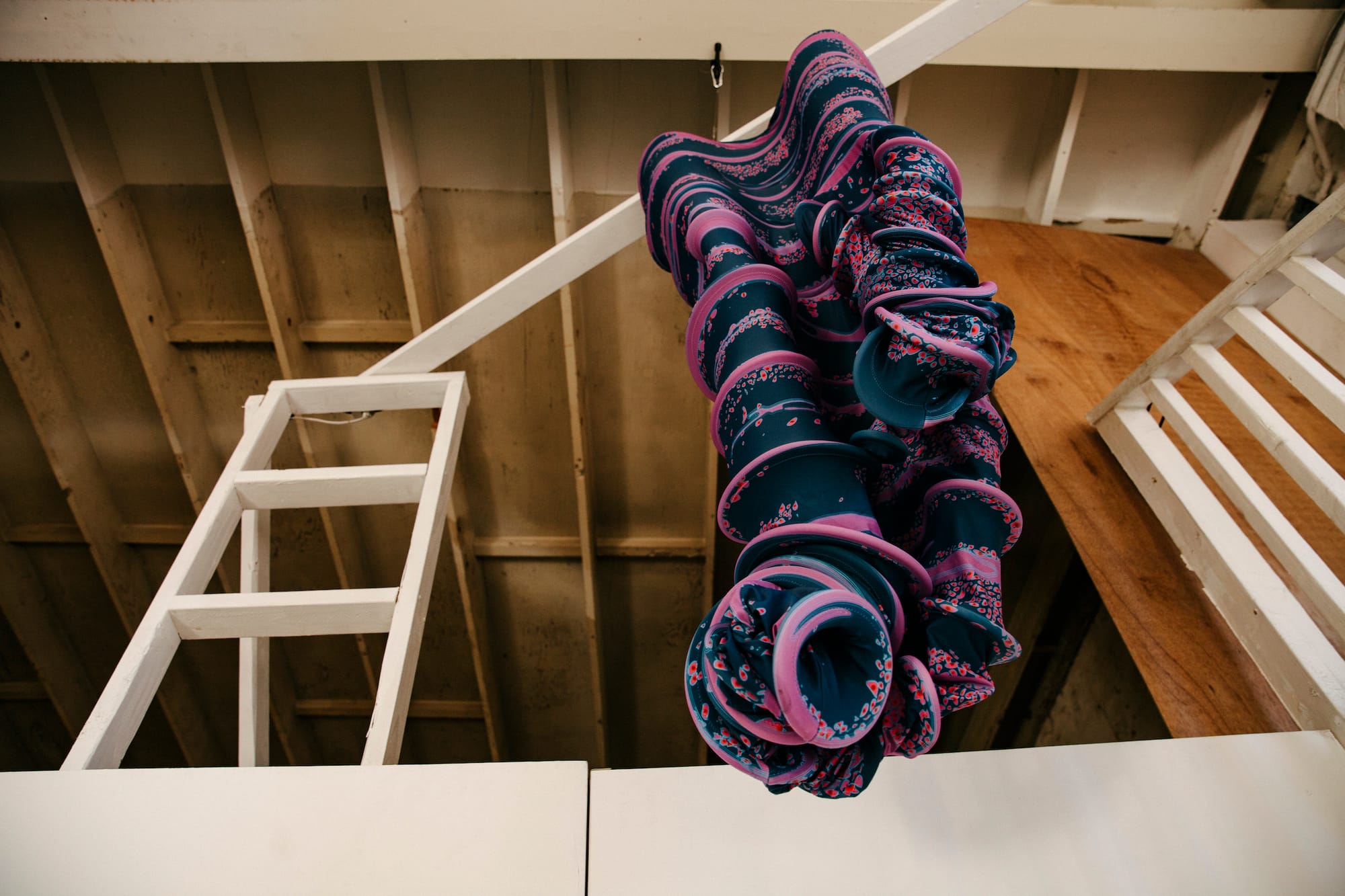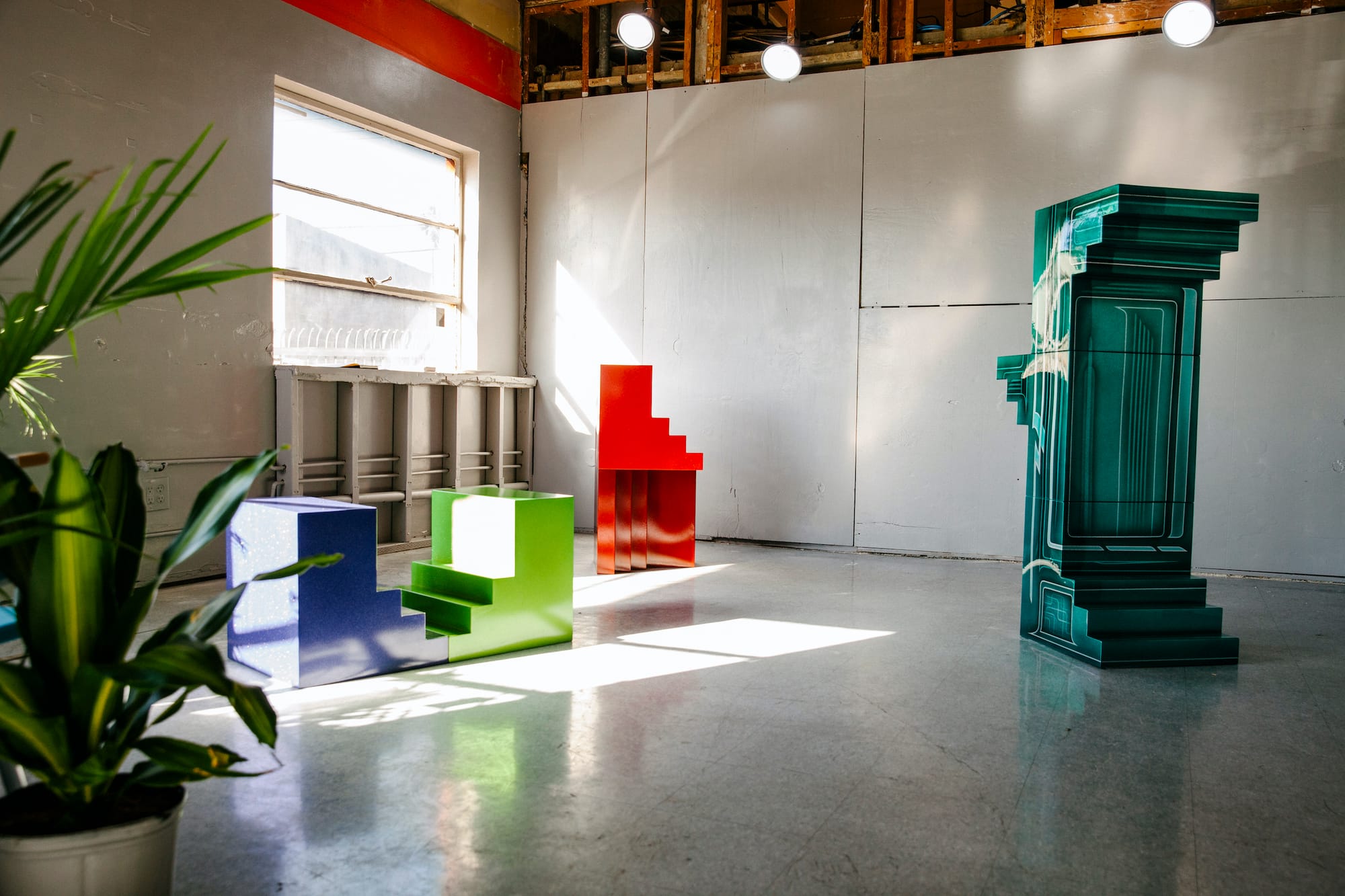 Metal worker Gabrielle Shelton presents sculptures of staircases with candy paint jobs inspired by LA's lowriders. The artist, interested in the metaphorical meanings of stairs throughout time — as, for example, symbols of growth or reaching higher levels of consciousness — positions her sculptures in nonfunctional ways that don’t lead anywhere.