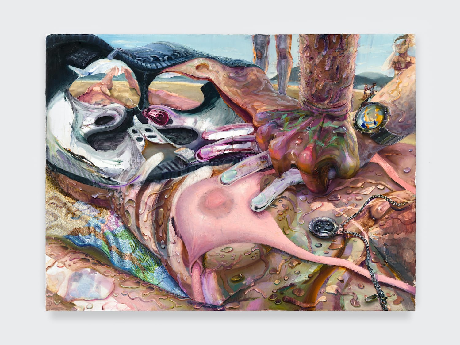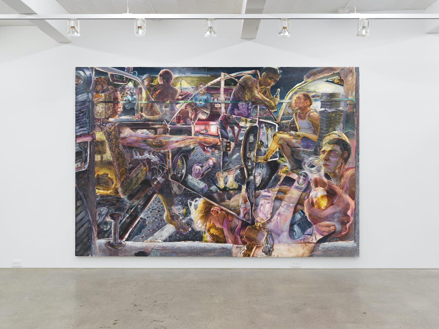 Lundy’s use of transparent planes (such as an open car door), elongation of forms (a bare leg), multiple perspectives, atmospheric lighting, trompe l’oeil details, and the body’s expulsions, particularly sweat, is a sharp contrast to much of the figurative painting being shown and celebrated in New York. Rather than working within the long-established conventions of a three-dimensional space, which proposes a stable world, she seamlessly incorporates filmic devices such as overlays and exaggerated close-ups that are often used in horror films, as well as microscopic and magnified views, to great effect.
