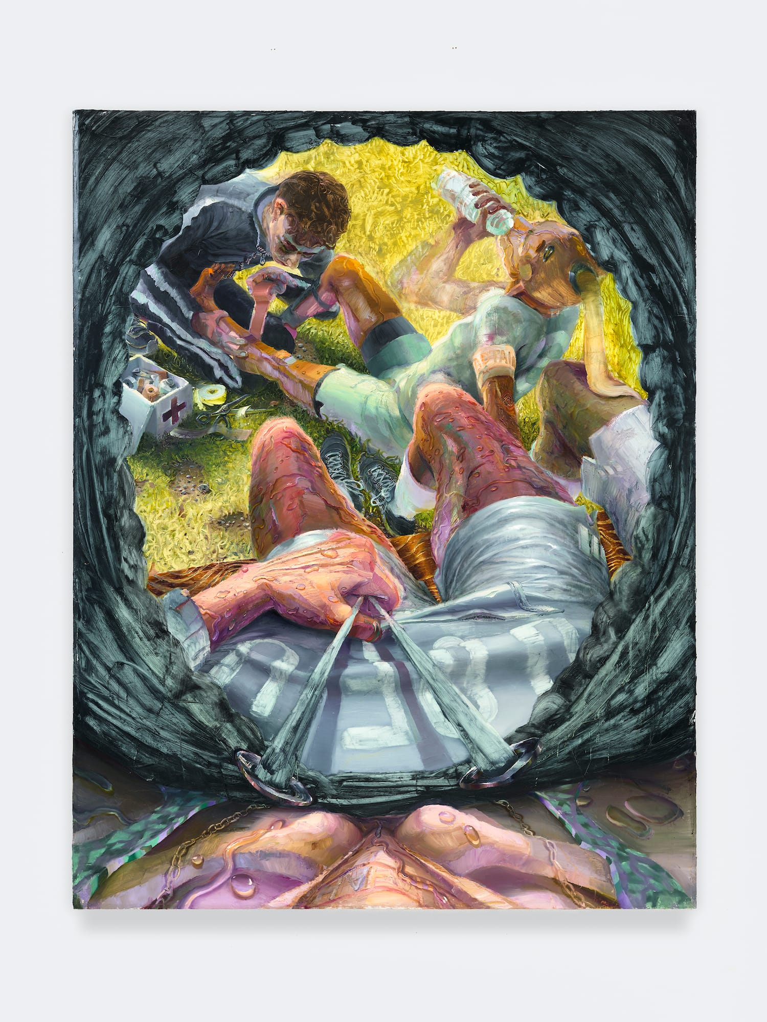 In “U of u” (2021), Lundy depicts a man with a medical kit wrapping a young woman’s straightened leg with an ACE bandage, while she chugs water from a plastic bottle. The viewpoint is from someone looking down through what looks like a shaft, but what is it exactly? Whose body has Lundy placed us in? How does being inside this body shape how we see the world? The last question seems fundamental, obvious, and important. This is one of the themes the artist returns to in her visceral evocations of the sweating, vomiting, active human body.