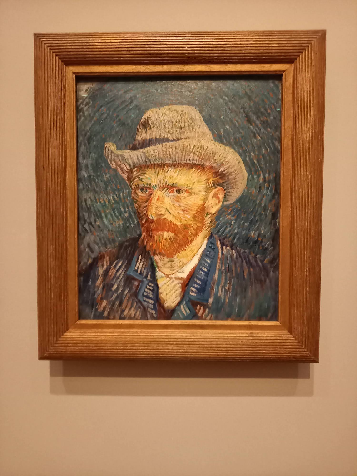 The art historical scope is comparatively narrow, both chronologically and thematically: Van Gogh was seemingly unconcerned with any external sociopolitical or other contemporaneous themes, and was additionally constrained by cost — many of the earliest pieces are on a standardized “artist board” size and or on reused grounds from other works. Most depict head and shoulders only; this allows for close stylistic and technical study to a degree that may not be afforded in an exhibition with a broader thematic scope. Thus in an unexpectedly dark early piece, "Self-Portrait with Felt Hat" (December 1886–January 1887, Van Gogh Museum, Amsterdam), wholly uncharacteristic of the color suffusing the majority of his oeuvre, the caption draws our attention to the technique of peinture à l'essence, in which oil paint is thinned with turpentine, insinuating that van Gogh absorbed the technique from acquaintances Henri de Toulouse-Lautrec and Edgar Degas.