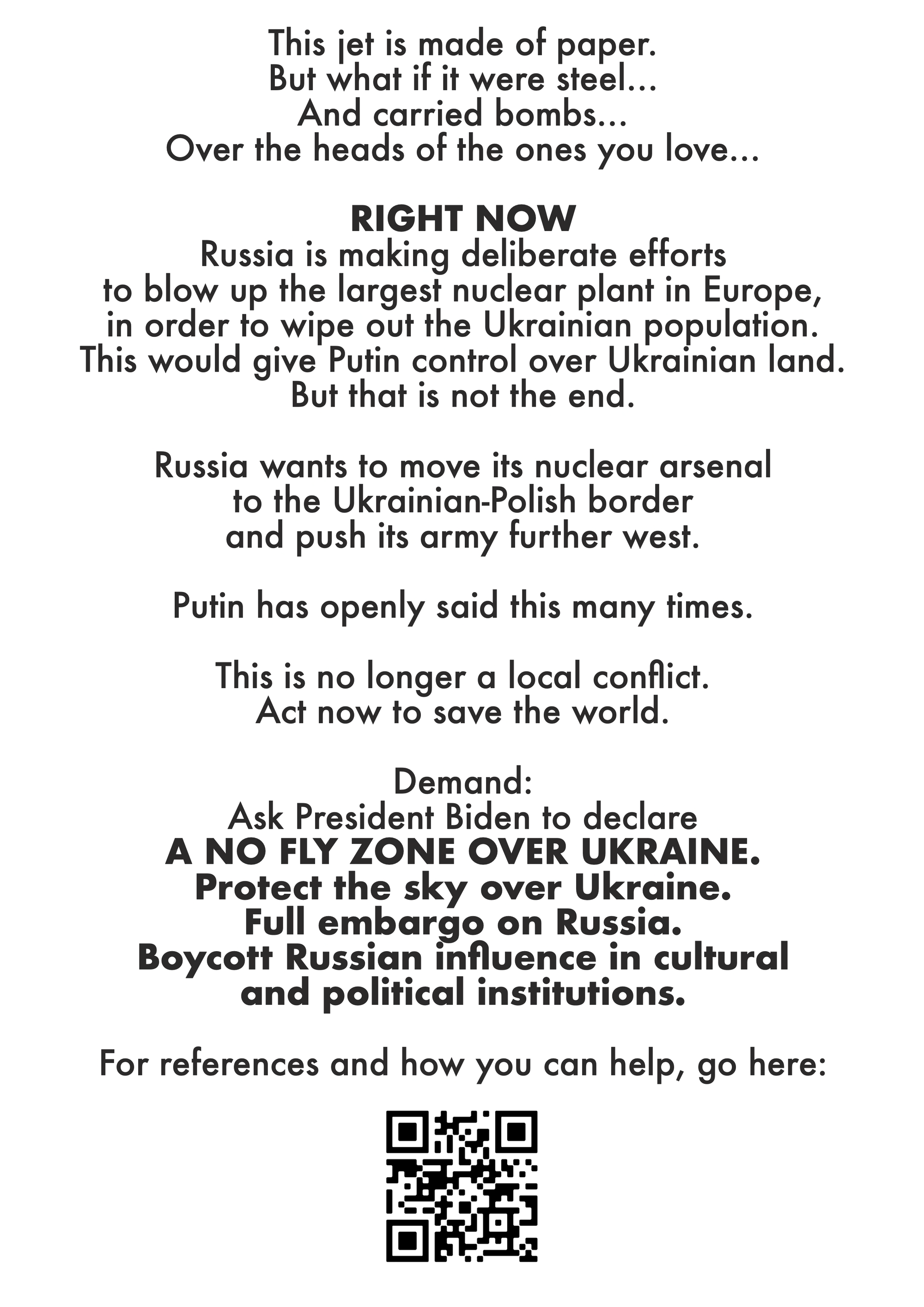 "Protect the sky over Ukraine," read the flyers-turned-planes, created by a group of New York-based artists and activists.