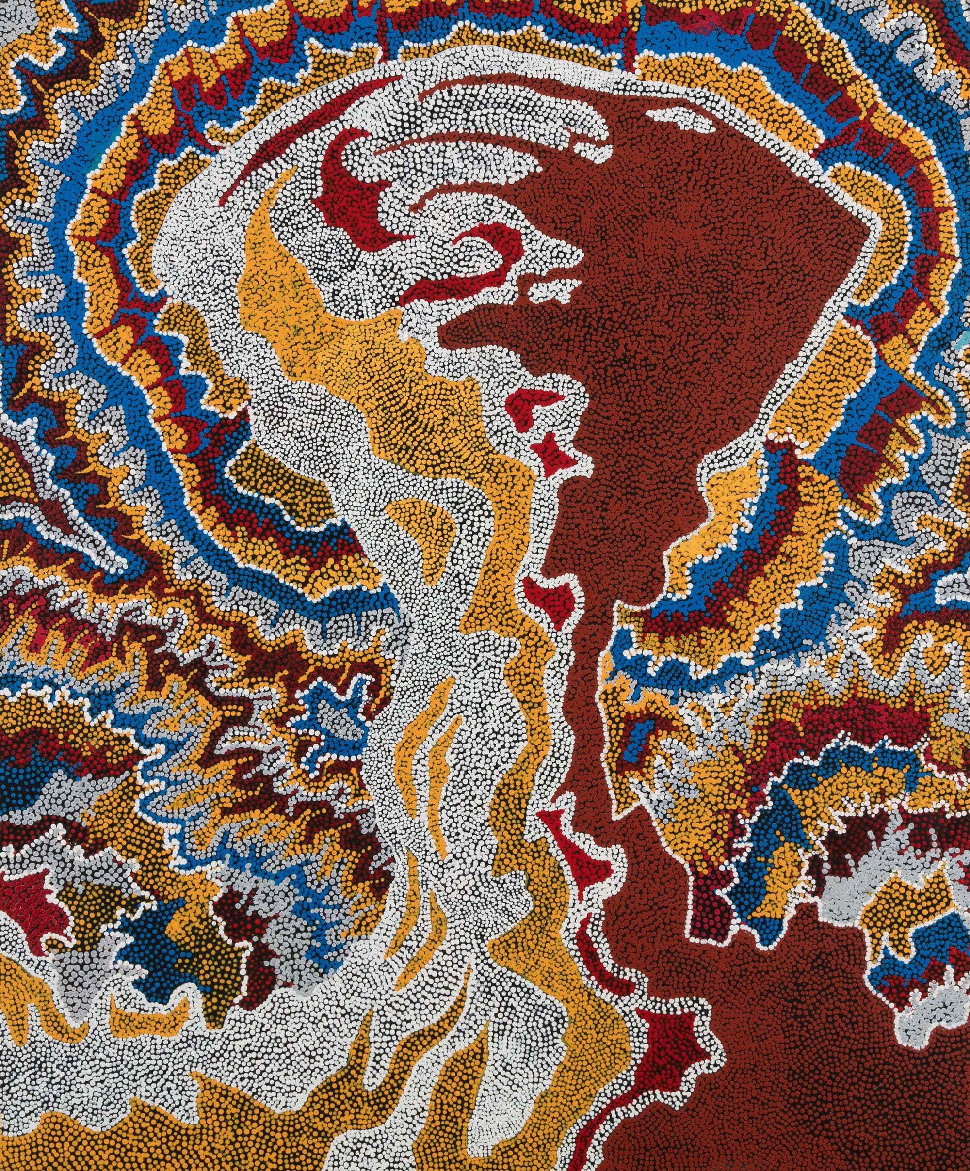 This is not to say that individual works didn’t resonate in the moment as well. Especially engrossing is the video installation by the APY Art Collective, featuring recent interviews with Aboriginal survivors of the Maralinga nuclear tests which were conducted by the British government in Australia during the 1950s and ’60s. The subjects’ words neatly encapsulate the exhibition’s throughline of environmental racism at its most insidious, recollecting feelings of shock, betrayal, and confusion, even if slightly numbed by the passage of time. The government not only stole their land, but also rendered it uninhabitable for generations, while killing members of their families and communities and sickening them, their unborn children, and their grandchildren.