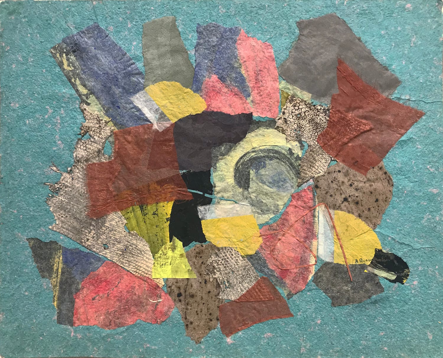 The 25 collages at Washburn invite the visitor to see them — and read them. Their equidistant positioning on the gallery walls creates the illusion of reading and then turning consecutive pages in a poetry collection. Many are framed by Ryan within wide margins consisting of variable beiges and whites. The collages also immediately call attention to their essence as gracefully manipulated and transposed papers of various types — colored, painted, creased, beveled, frayed, deckle-edged — fusing abstract art to writing’s etymological roots in text, textile, and textura — “that which is woven.”