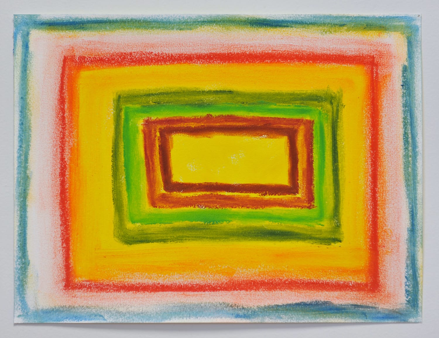 The freshness of these paintings is a result of Korman starting with oil stick drawings, which are meant to stand on their own, and do. In the drawings, she proceeds improvisationally: each color rectangle and the space it takes up determines what happens next. The width of the framing rectangles is markedly different and follows no pattern. The drawings work incrementally, in a process of adding without erasing or covering over one color with another that has its roots in Jackson Pollock and his poured paintings.