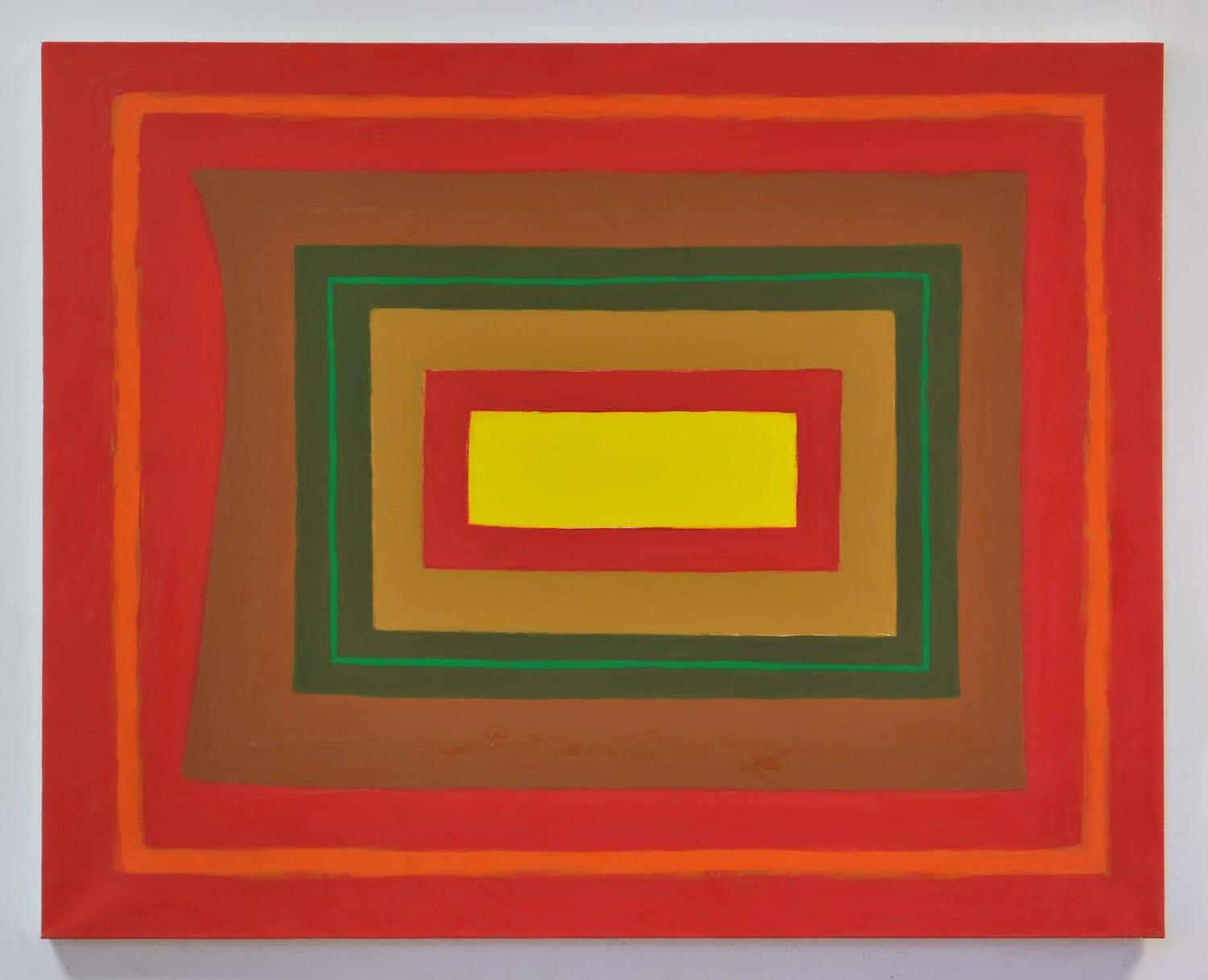 At one point, I limited my focus to the edges of the concentric rectangle, and how some were curved, which made the concentric planes appear as if they were billowing. Then I began accounting for all that was not a concentric rectangle: a floating, diagonal, yellow-orange brushstroke within the deep orange rectangle in the center of the painting, a brown line within the narrow, red, centered lozenge-like rectangle.