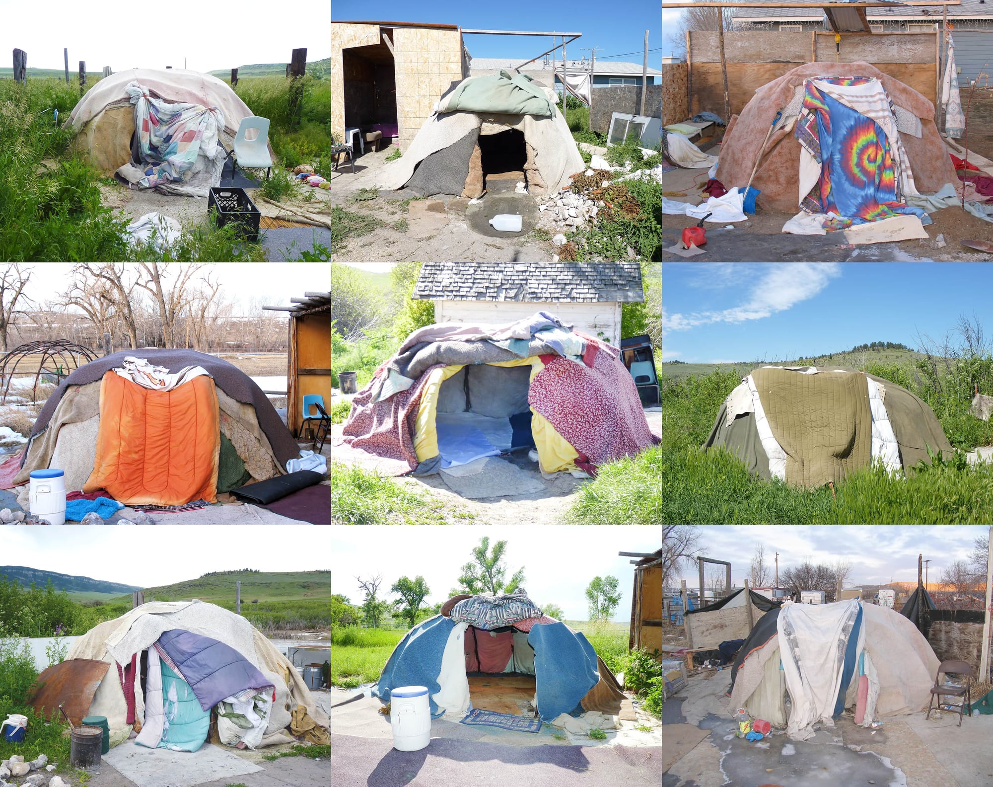 Another reference to European art history appears in “My Home Is Where My Tipi Sits” (2011). Red Star’s photos of sweat lodges, HUD houses, cars, signs, and churches from the Crow reservation are arranged in tight grids that recall Hilla and Bernd Becher’s austere 20th-century black and white photos of European and North American industrial architecture. However, Red Star resists the Bechers’ distanced, ethnographic tone by recording her subjects up close and in color. Her works send the message that her community’s landscape is best documented by someone from the inside.