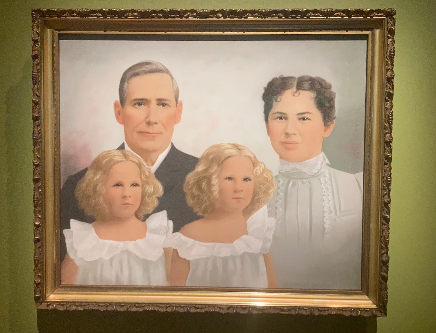 Mary E. (May) Bangs, Elizabeth Snow (Lizzie) Bangs, and Spirits, "Precipitated Portrait of Lizzie, Mary and Christina Daugherty with Dr. Daugherty" (c. 1900), precipitated by Spirit: pigment on canvas, Camp Chesterfield, Hett Art Gallery and Museum, Chesterfield, Indiana