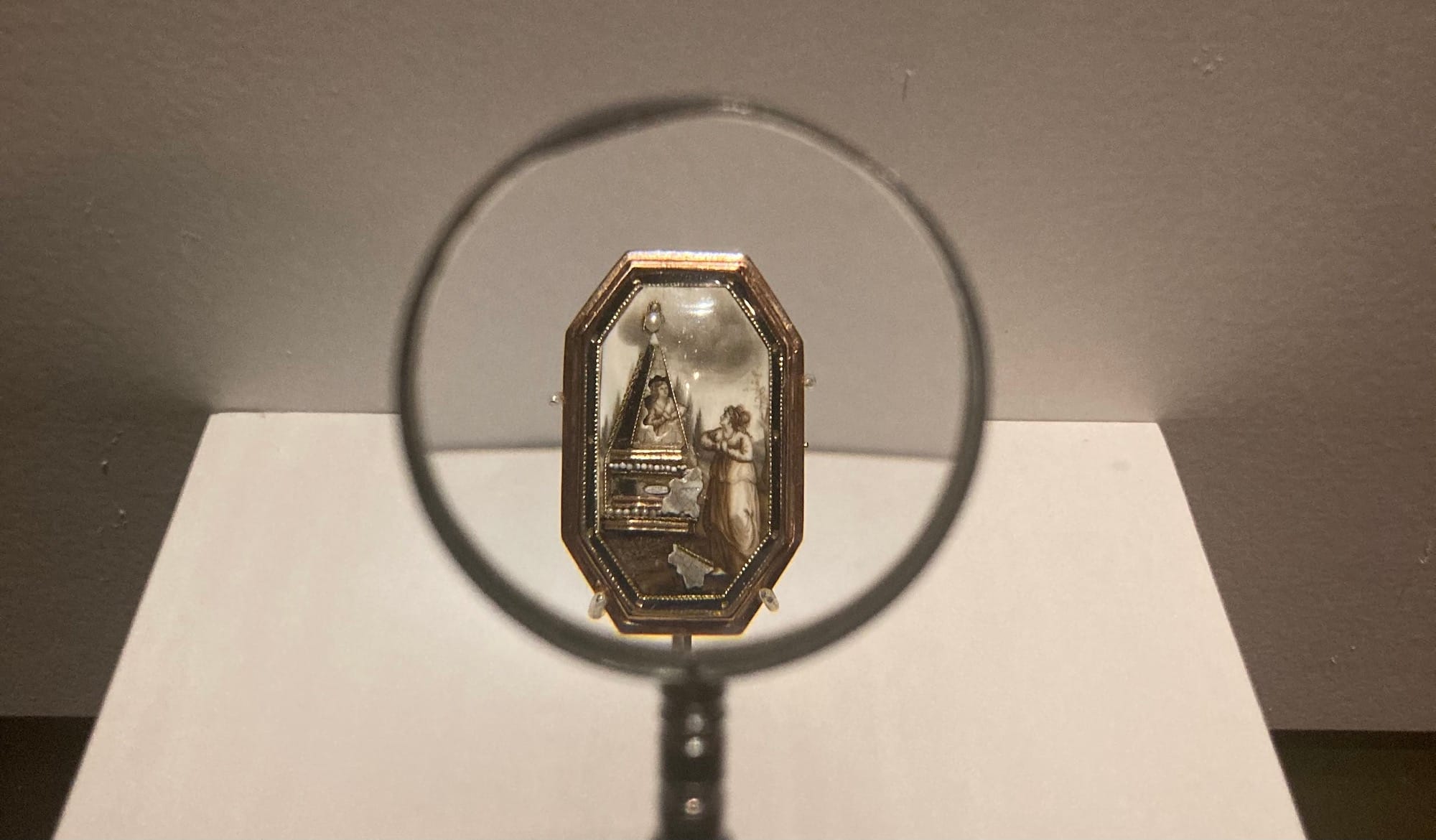 "Memorial for S.C. Washington," (c. 1789), watercolor, chopped hair, gold wire, pearls, and applied ivory on ivory, promised bequest of Davida Tenenbaum Deutsch and Alvin Deutsch, L.L.B., 1958, in honor of Kathleen Luhrs, Yale University Art Gallery, New Haven, Connecticut