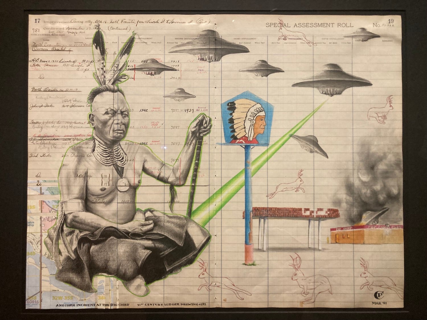 Chris Pappan, "Another Incident at the Big Chief" (2021), graphite, colored paper, ink, and map collage on Evanston Municipal ledger dated 1923-24, Collection of Amy Gordon and Daniel Dunn